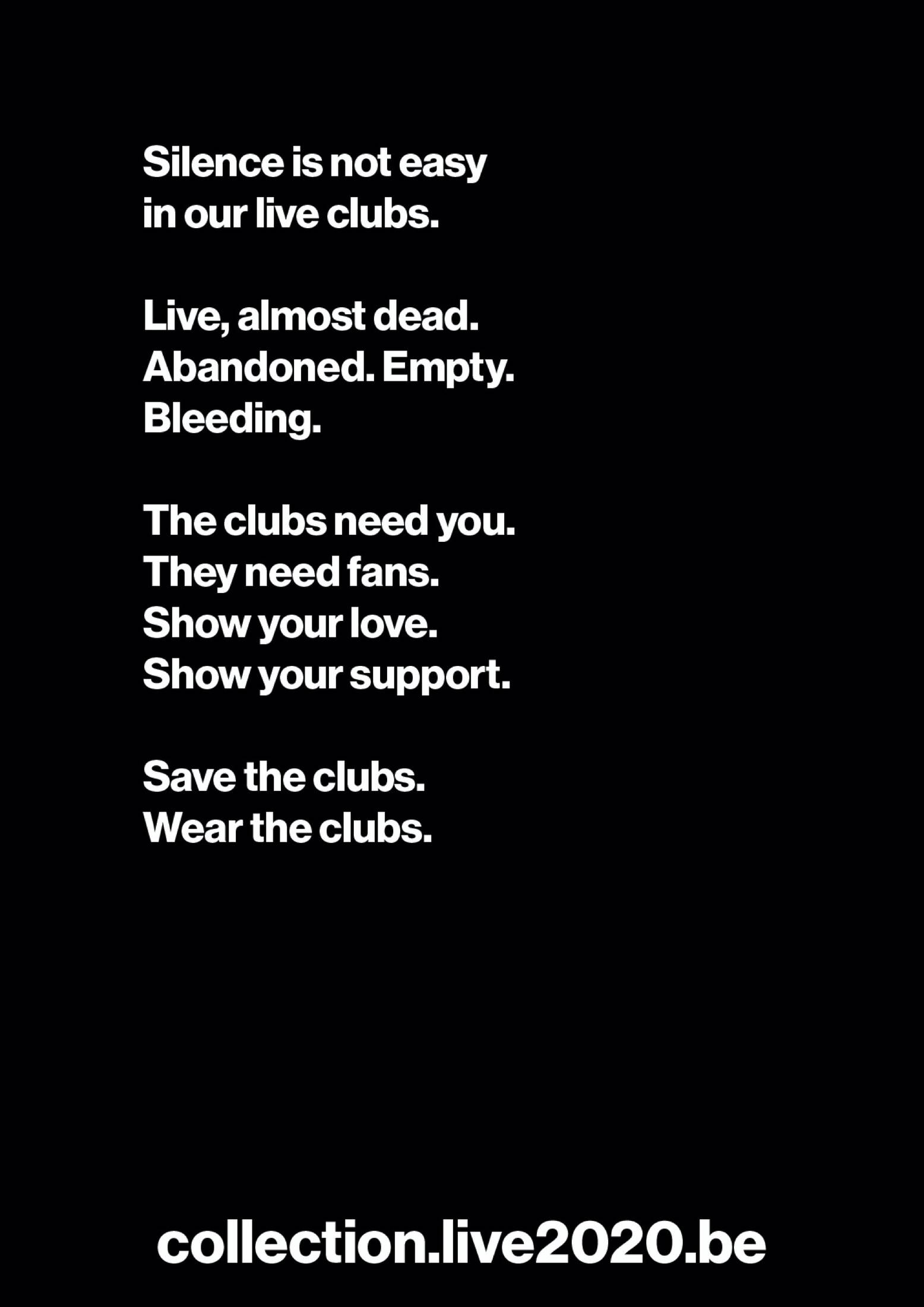 This professional campaign titled 'Save the clubs. Wear the clubs.' was published in Belgium in December, 2020. It was created for the brand: Live2020, by ad agency: Happiness Brussels. This Integrated medium campaign is related to the Music, Public Interest, and Recreation, Leisure industries and contains 8 media assets. It was submitted almost 5 years ago.