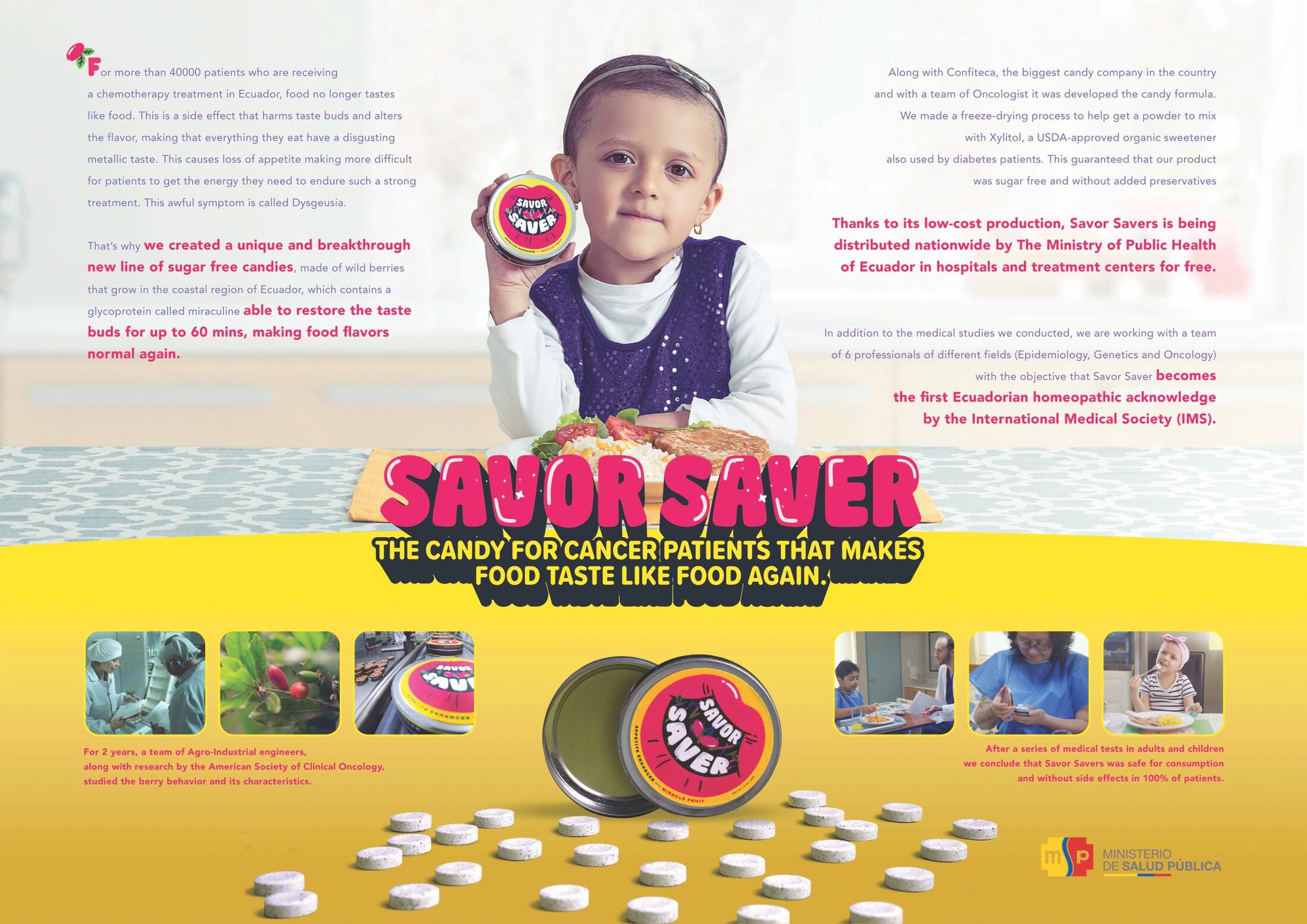 This professional campaign titled 'Savor Saver' was published in Ecuador in November, 2017. It was created for the brand: Ecuador Ministry of Public Health, by ad agency: WPP. This Static Images medium campaign is related to the Public Interest industry and contains 2 media assets. It was submitted almost 7 years ago.