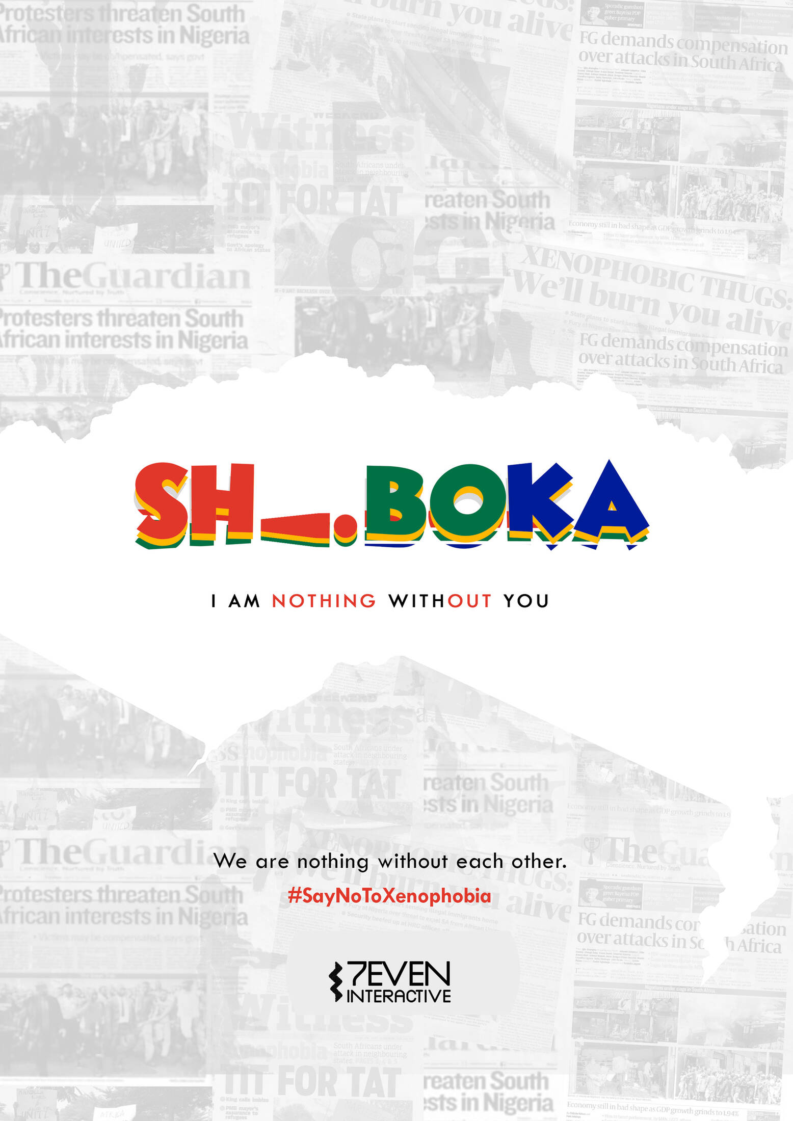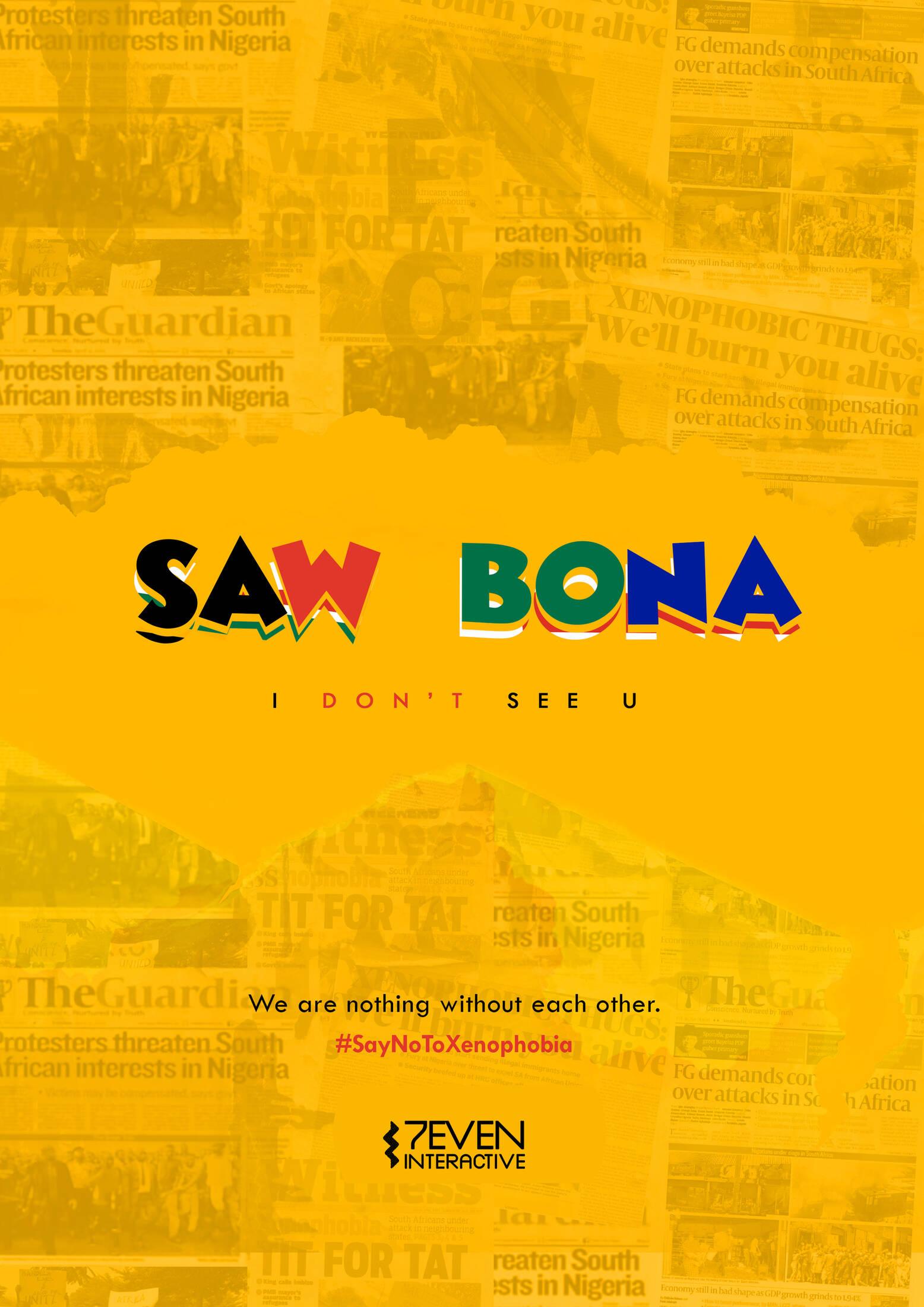 In the wake of the Xenophobic attacks on other African nationals in South Africa, we decided to remind South Africa, of its famous phrase with which it welcomes visitors: SAWUBONA (I SEE YOU). The response to this is SHIBOKA (I EXIST FOR YOU). To drive home the point that we are incomplete without the other, we removed 'U' from sawubona, with the tagline, I DON'T SEE U. In the second press execution, we put the 'i' in shiboka on the ground, symbolising those that have been killed or attacked so far in the violence. We used the tagline I AM NOTHING WITHOUT YOU. #SayNoToXenophobia