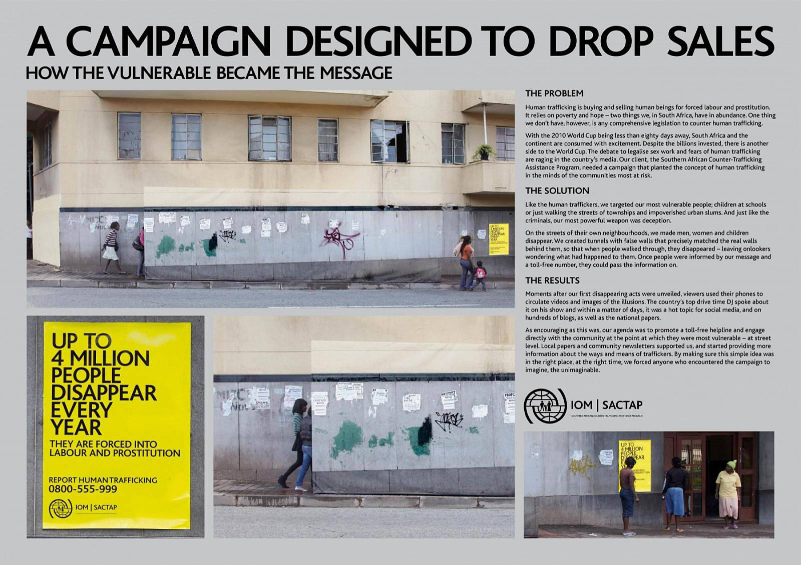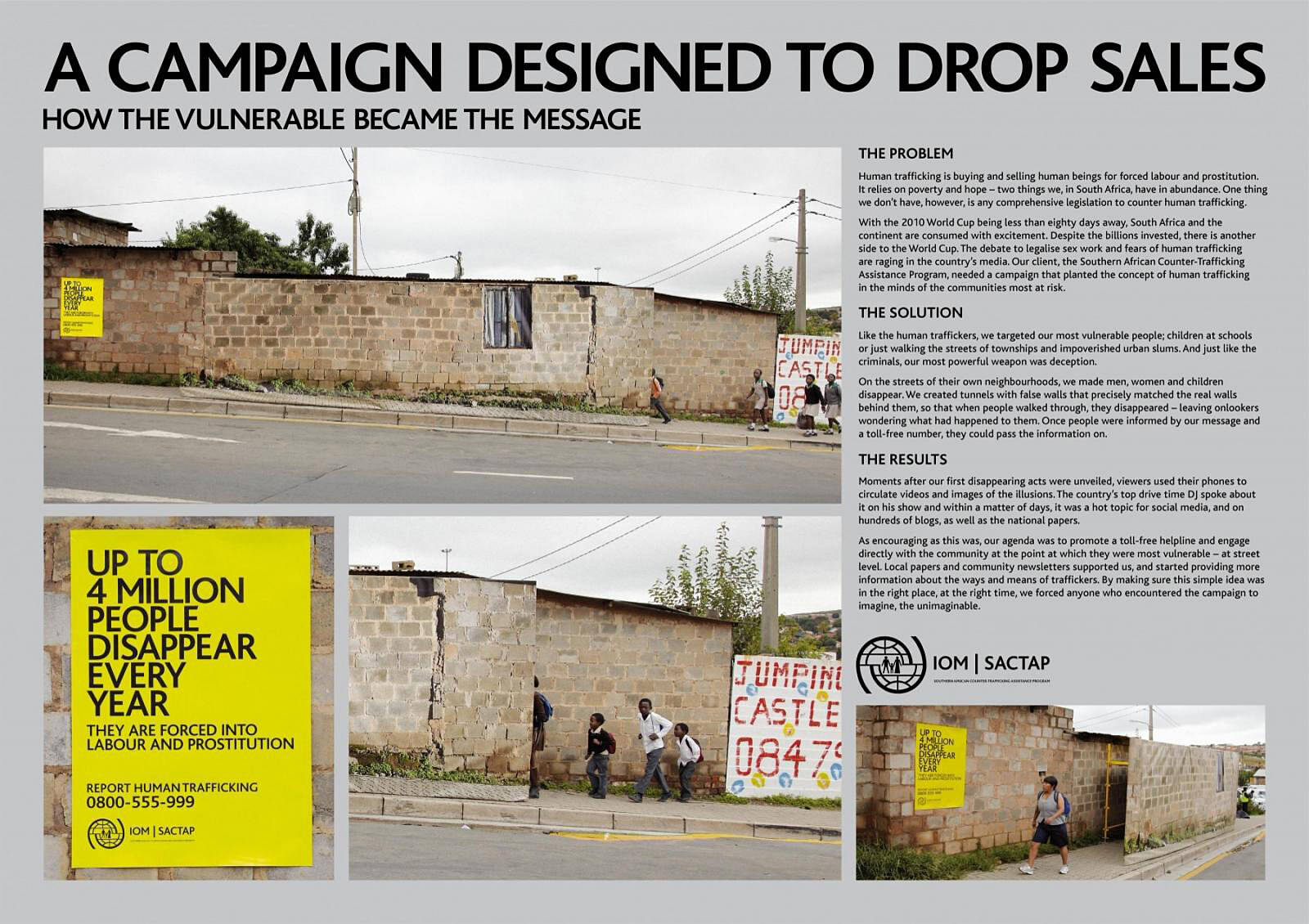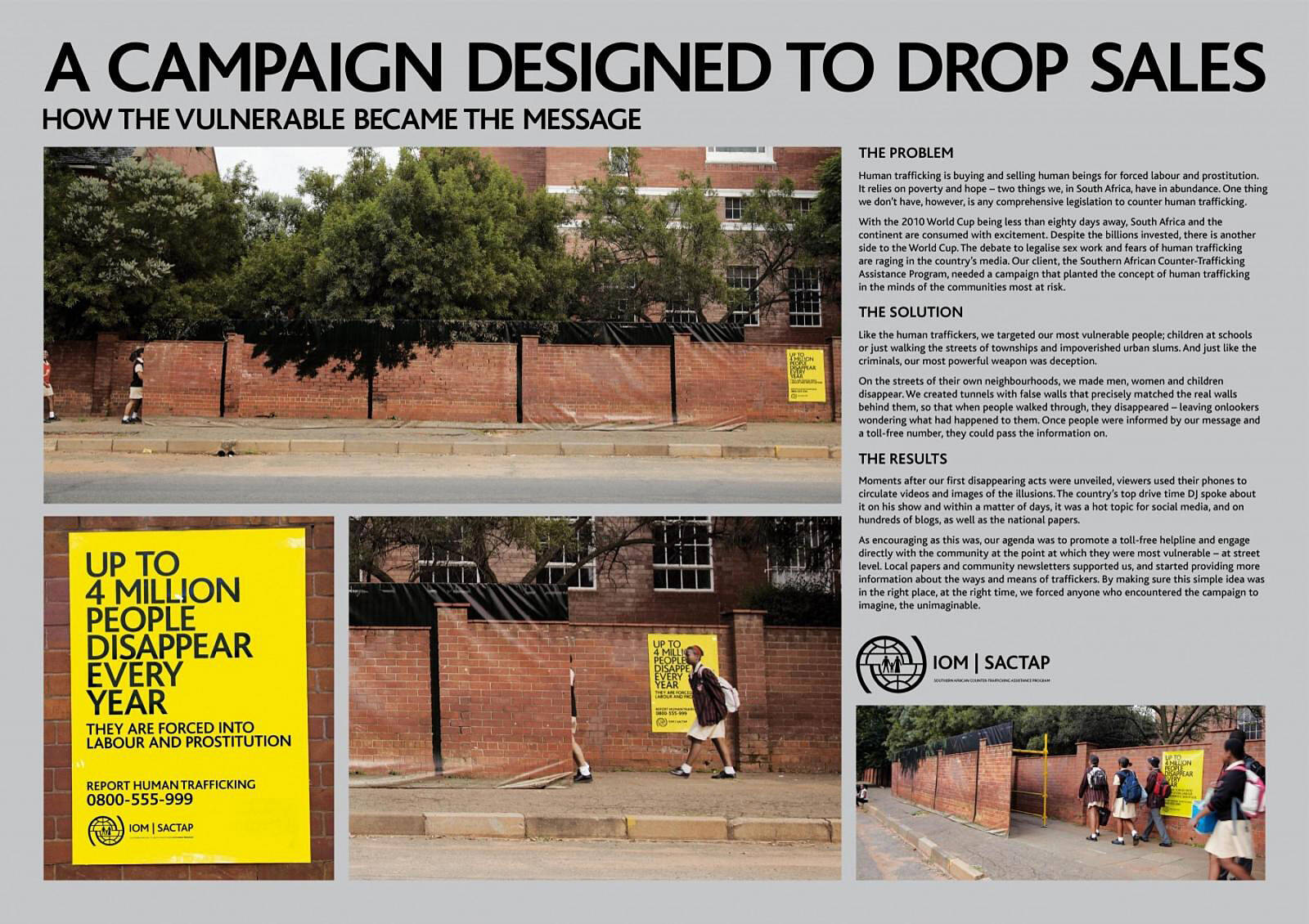 This professional campaign titled 'School, Hillbrow, Alexandra Township' was published in South Africa in June, 2010. It was created for the brand: International Organisation For Migration, by ad agency: TBWA. This Ambient medium campaign is related to the Public Interest industry and contains 3 media assets. It was submitted over 15 years ago.