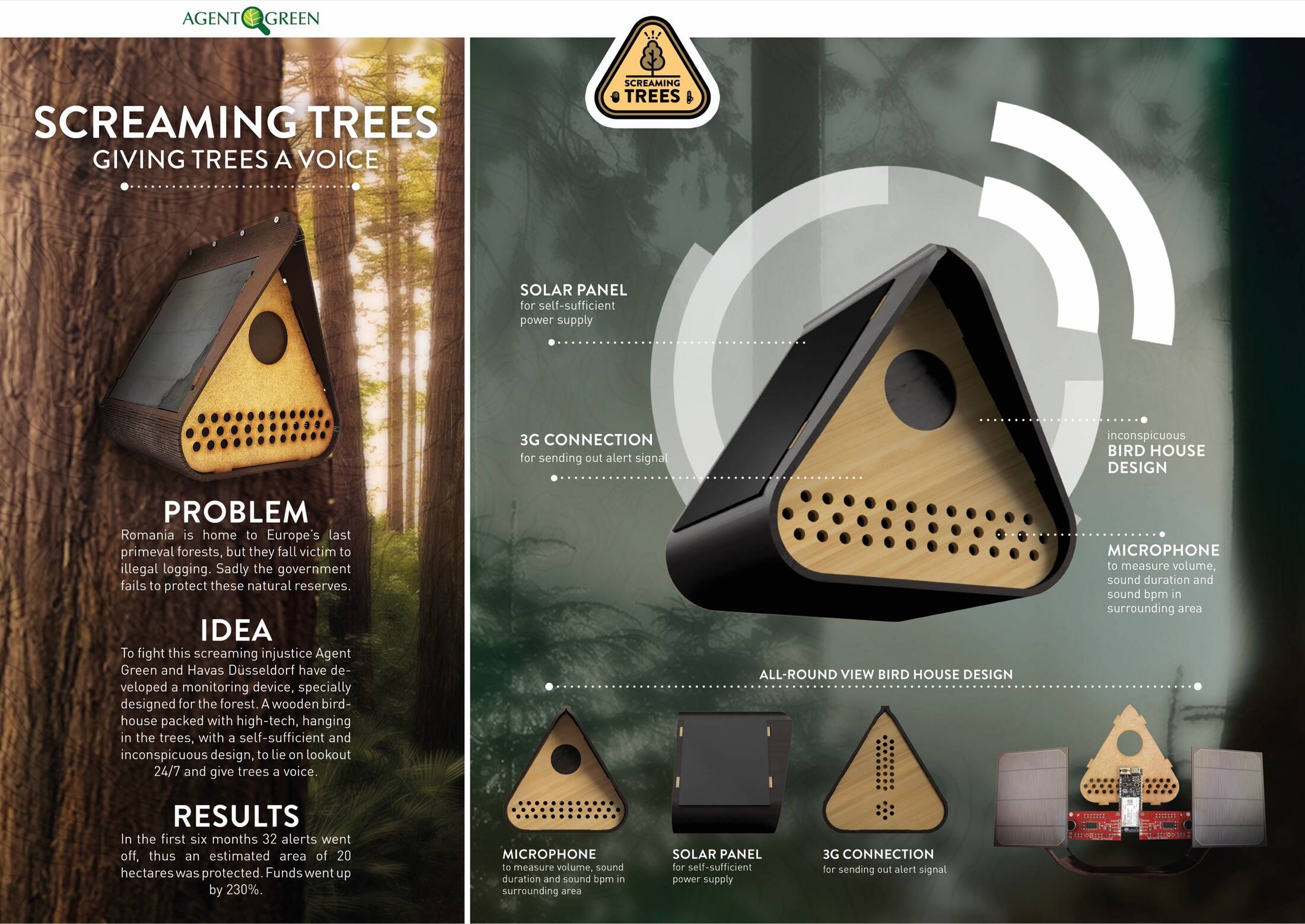 This professional campaign titled 'Screaming Trees' was published in Romania in April, 2018. It was created for the brand: Agent Green, by ad agency: Havas. This Ambient medium campaign is related to the Public Interest industry and contains 2 media assets. It was submitted almost 7 years ago.