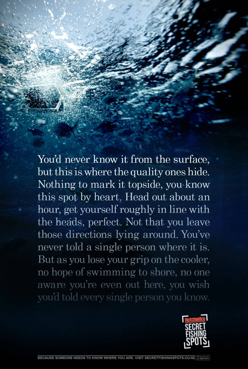 This professional campaign titled 'Secret Fishing Spots' was published in New Zealand in February, 2013. It was created for the brand: Hutchwilco, by ad agency: DDB. This Print medium campaign is related to the Automotive and Personal Transportation industry and contains 3 media assets. It was submitted almost 13 years ago.