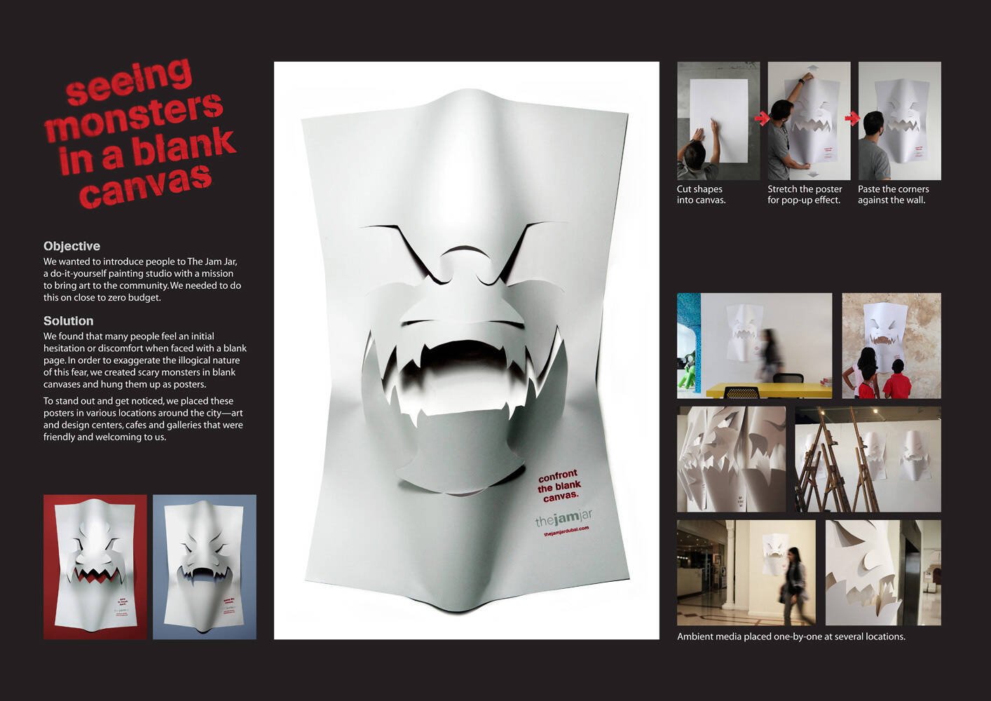This professional campaign titled 'Seeing monsters in a blank canvas' was published in United Arab Emirates in February, 2010. It was created for the brand: TheJamJar, by ad agency: Ogilvy. This Ambient medium campaign is related to the Professional Services industry and contains 1 media asset. It was submitted almost 16 years ago.