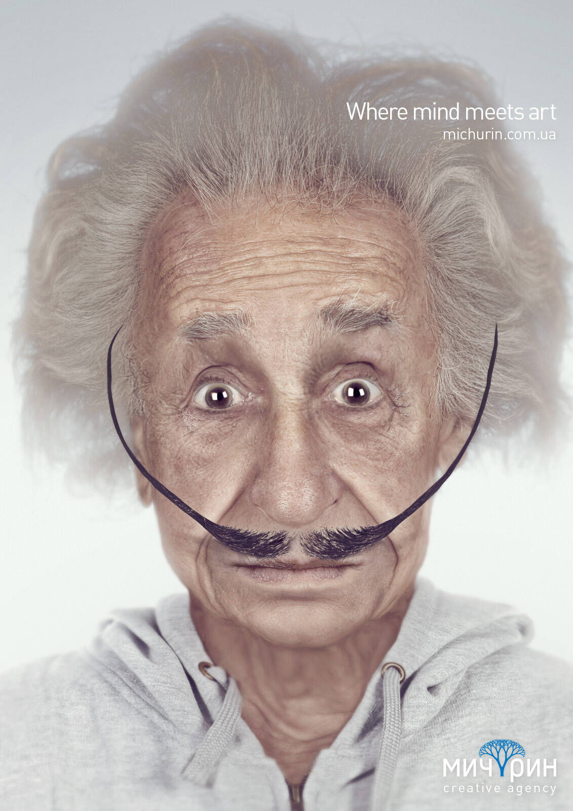 Self-promo print reveals the Michurin agency positioning - the selection of best professionals as well as ideas. We mixed the outstanding mind of Albert Einstein with the extravagant nature of Salvador Dali. The result of this exclusive selection became an ideal creator. "Michurin" - the place where mind meets art.