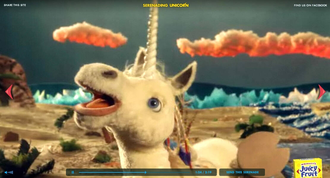 This professional campaign titled 'Serenading Unicorn' was published in United States in April, 2010. It was created for the brand: Wrigley’s, by ad agency: Evolution Bureau. This Digital medium campaign is related to the Confectionery, Snacks industry and contains 1 media asset. It was submitted over 15 years ago.