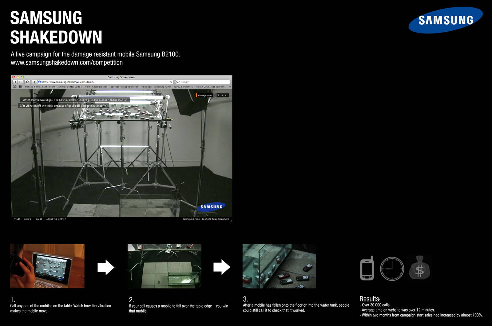 This professional campaign titled 'Shakedown' was published in Sweden in December, 2010. It was created for the brand: Samsung, by ad agency: From Stockholm With Love. This Digital medium campaign is related to the Electronics, Technology industry and contains 1 media asset. It was submitted about 15 years ago.