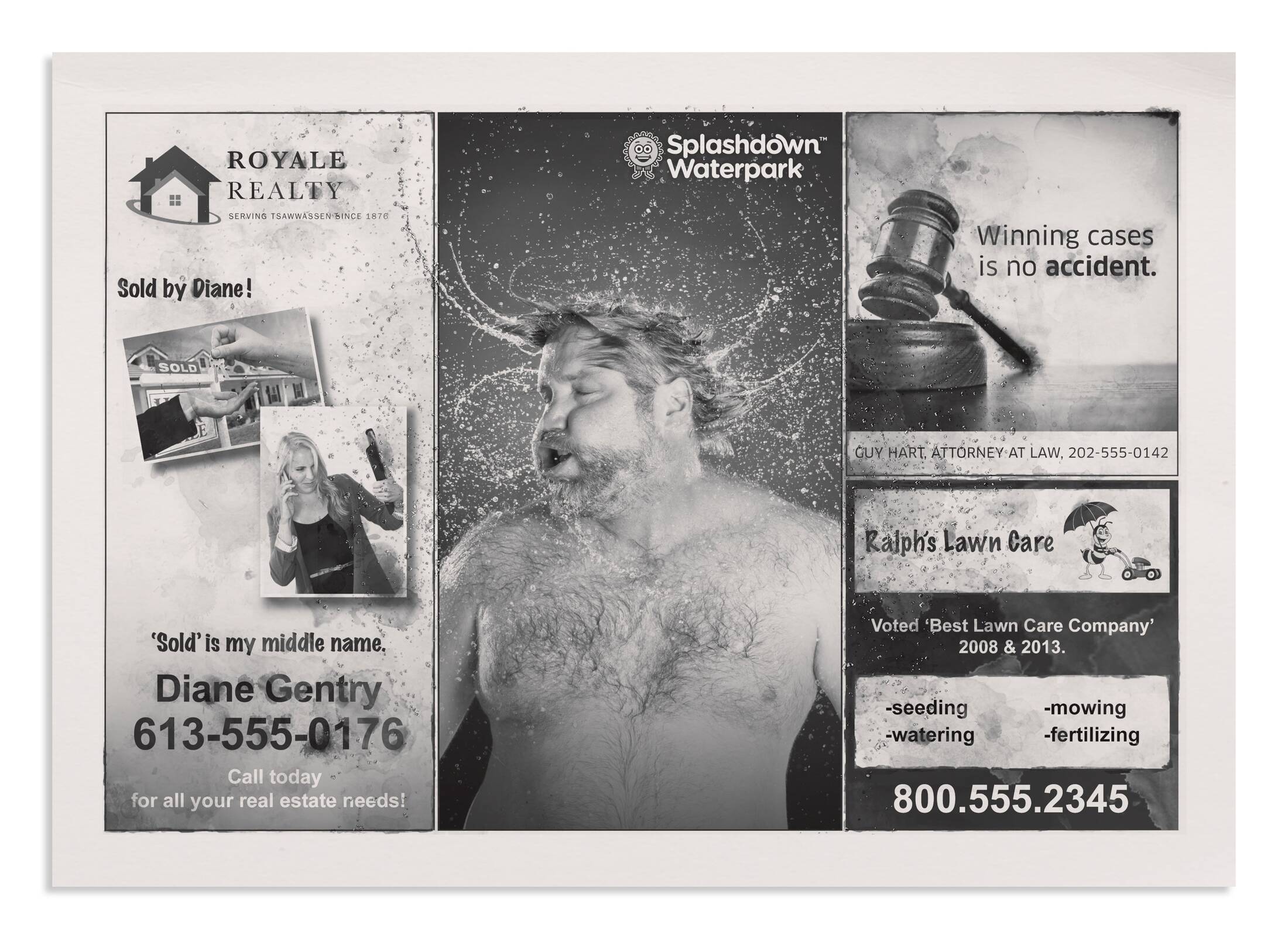 To recreate the uncontainable wetness that happens in the waterpark, ads for Splashdown Park were placed between fake, water damaged ads to make it look like Splashdown soaked other advertisers.