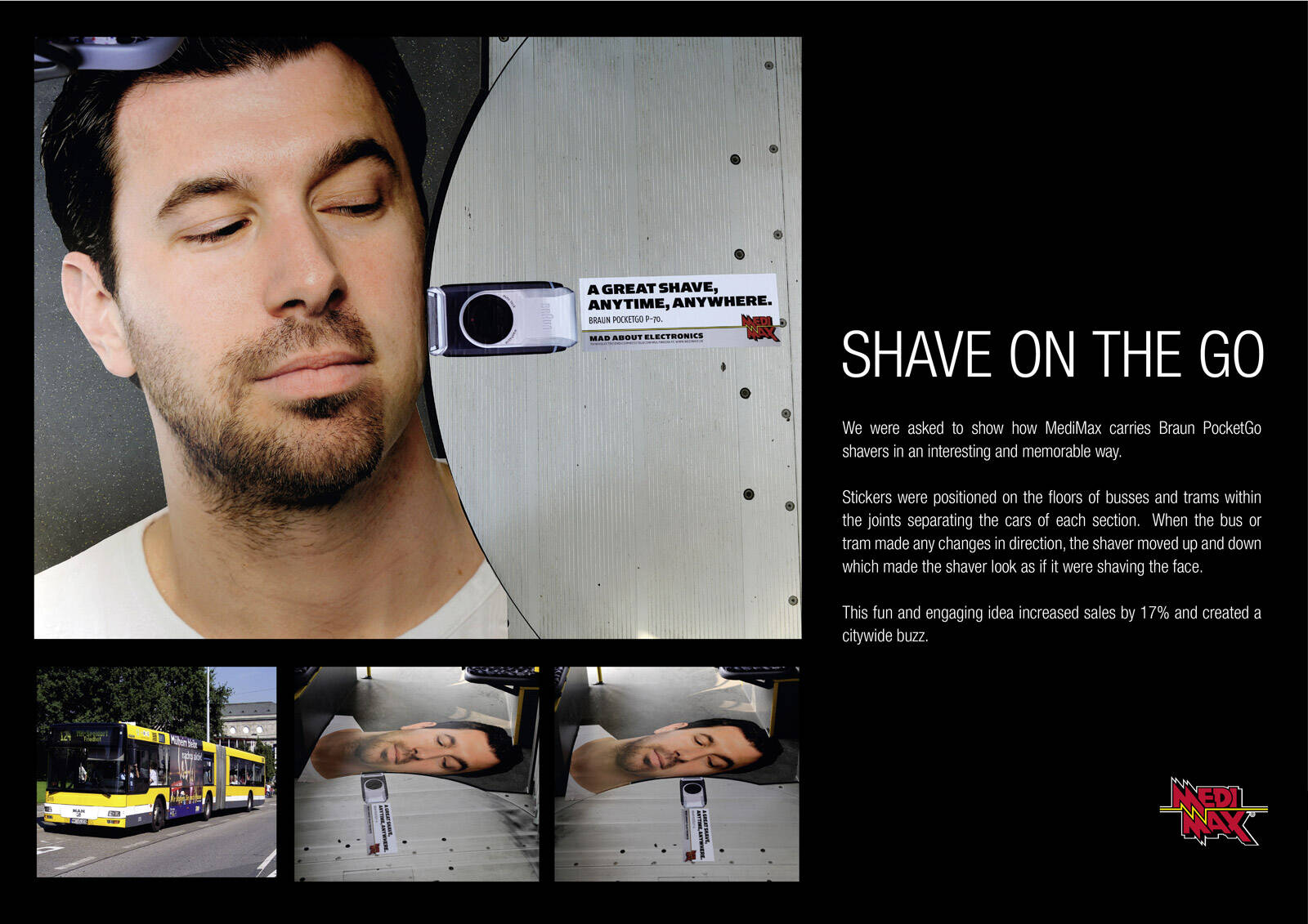 This professional campaign titled 'Shave on the go' was published in Germany in June, 2009. It was created for the brand: MediMax, by ad agency: BBDO. This OOH Outdoor medium campaign is related to the Electronics, Technology industry and contains 1 media asset. It was submitted over 16 years ago.