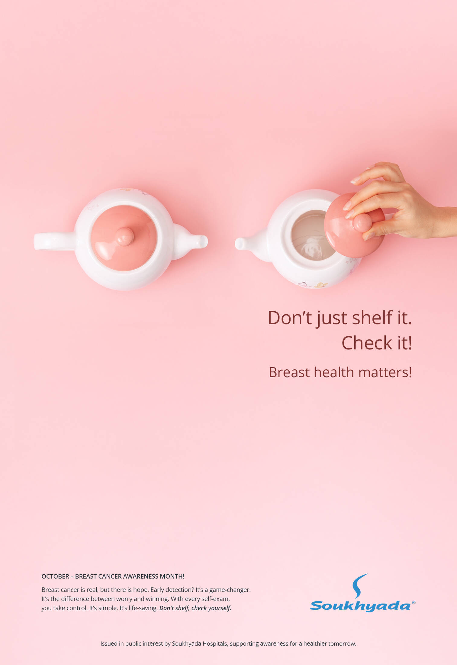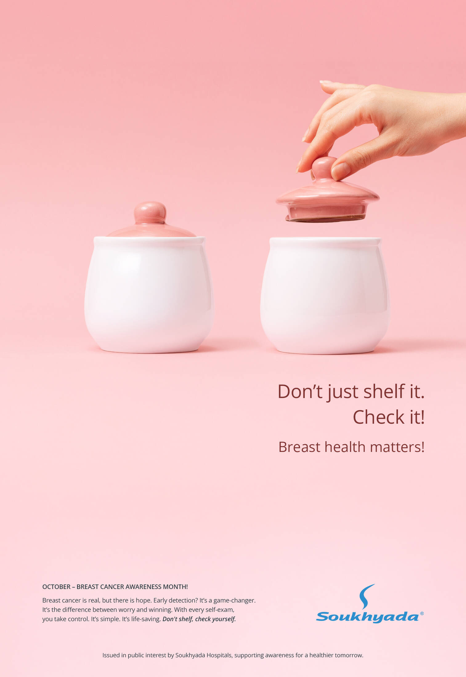 Breast health is a priority, not a pause. This Breast Cancer Awareness Month, the "Shelf Awareness" campaign by Soukhyada Hospitals highlights the importance of regular self-exams for early detection. The visuals feature women’s hands lifting lids off teapots and jars that have been sitting on the shelf for too long, symbolizing the need to inspect and open up—just like performing a self-exam.