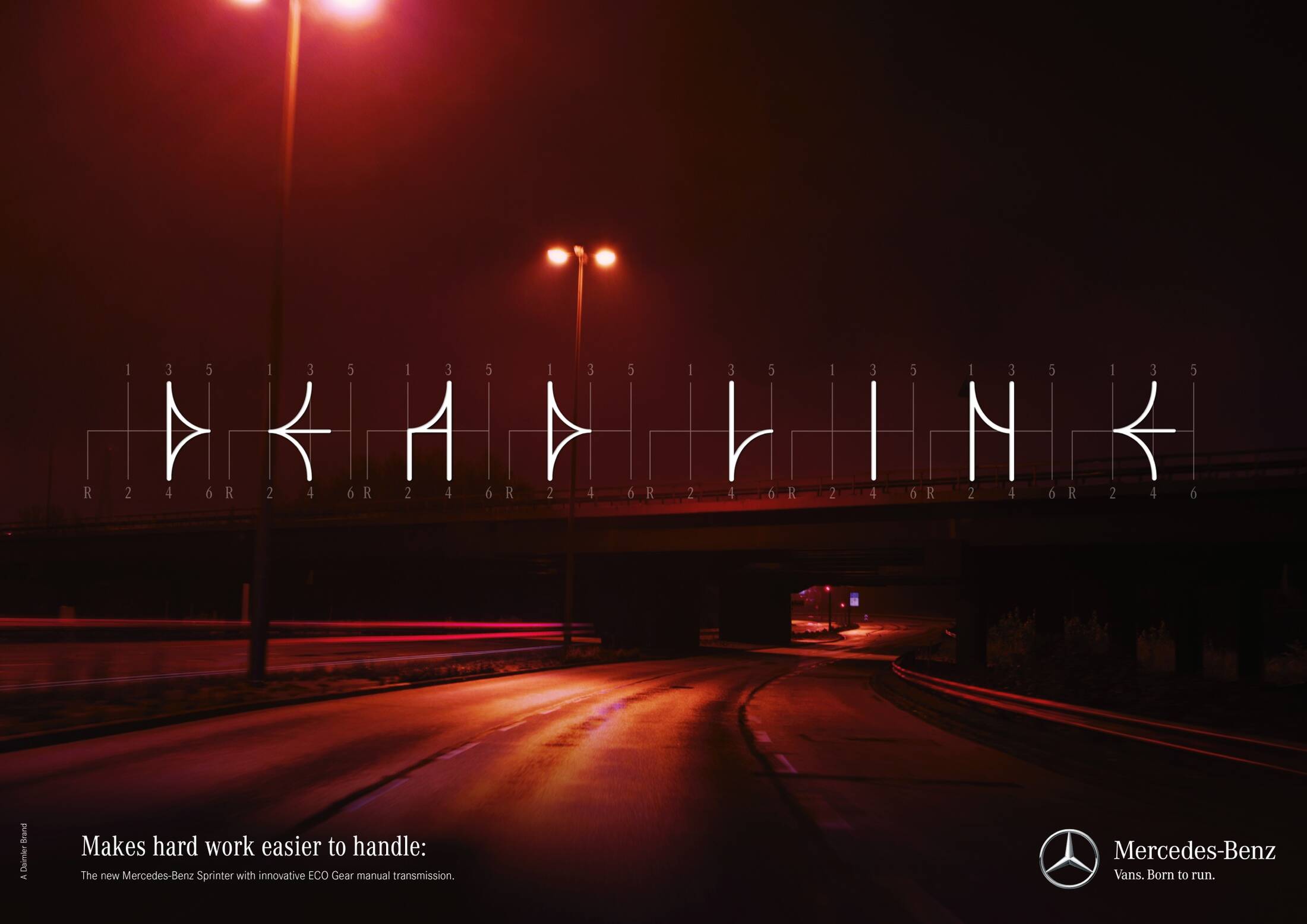 People in the Sprinter target group don’t do nine-to-five jobs. Night shifts, overtime and unscheduled events place new demands on human and machine every day. It’s a good job that the new Sprinter with six-speed gearbox adapts perfectly to the individual needs of its drivers. To show that it is on hand to make light work of hard tasks, we developed the first ever font to be generated from real gear change manoeuvres: Shiftography. To generate the font, we tracked the gear change manoeuvres during a courier driver’s night shift. A complete alphabet was created from the various gear changes. Watch the documentation: http://vimeo.com/85438562