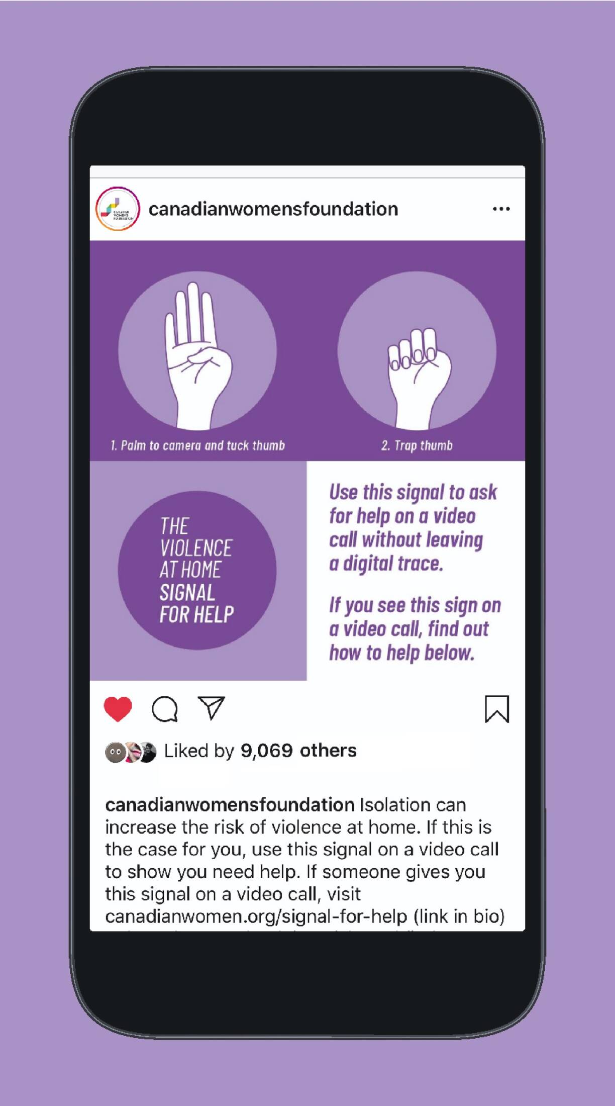Isolation can increase the risk of violence at home. Signal for Help is a single-handed gesture designed to provide individuals who are confined to their homes with their abusers a method to discreetly communicate over a video call that they need help and would like someone to check in safely with them. The initiative was launched in Canada on April 14th through a social, digital, and influencer campaign.