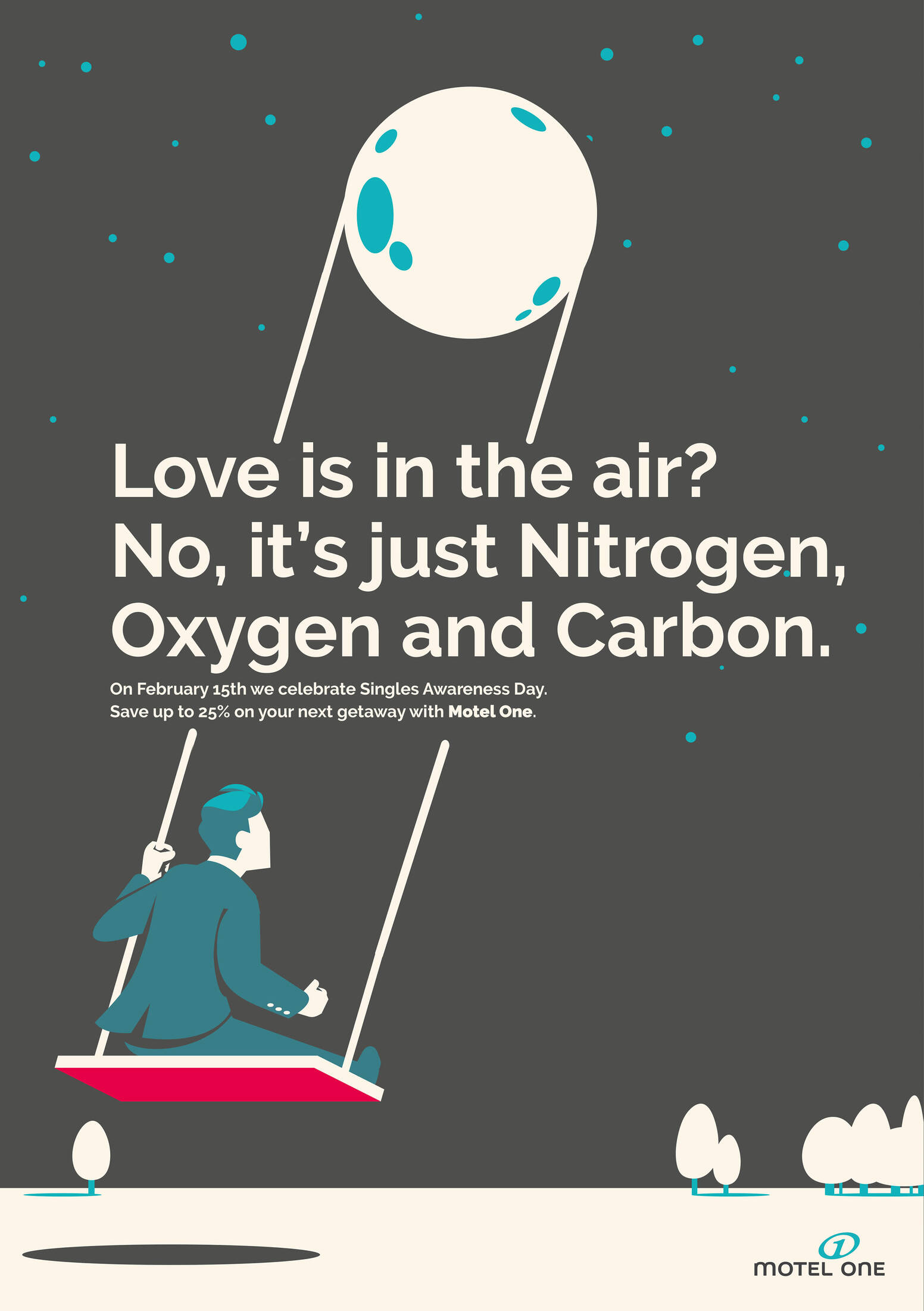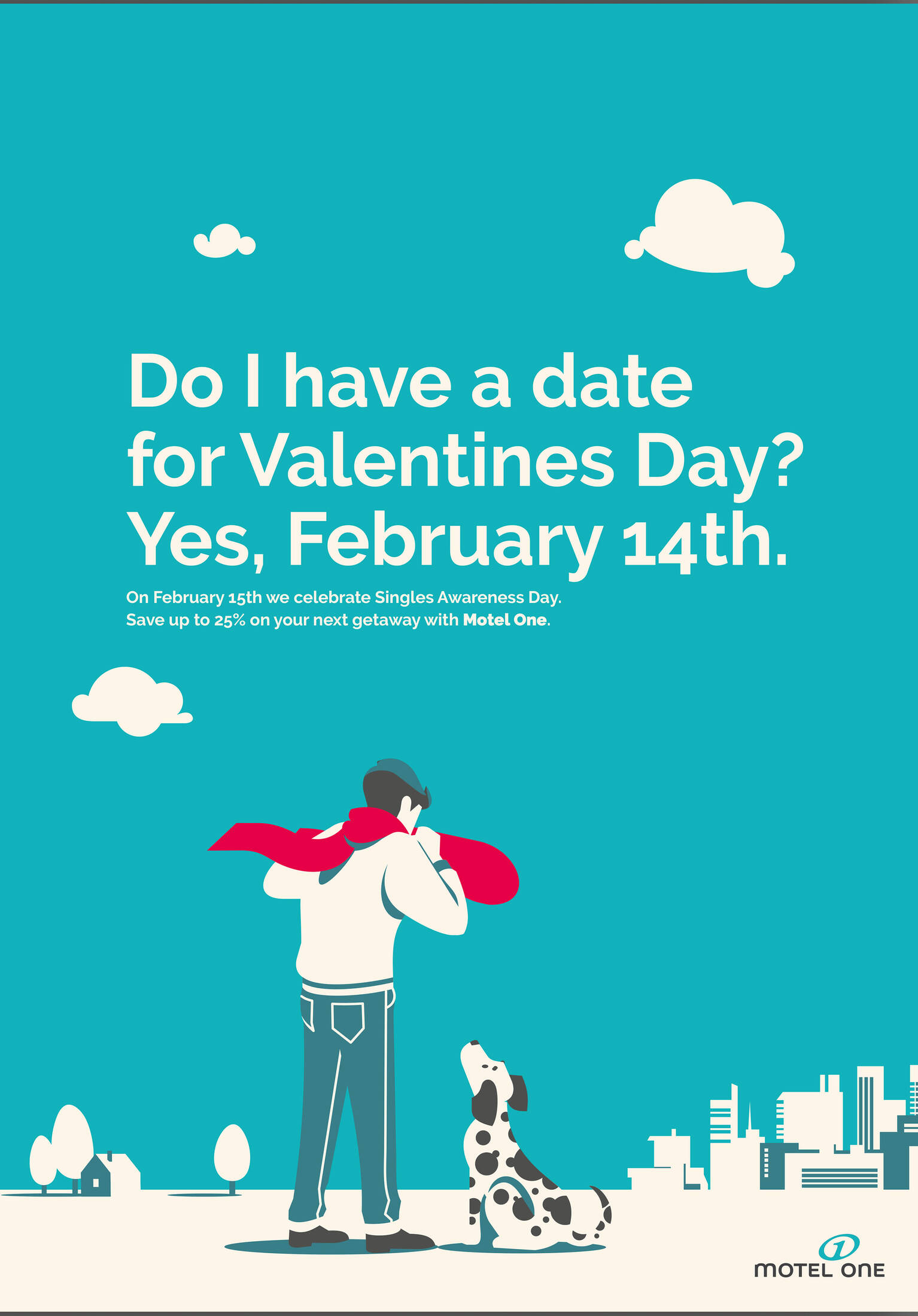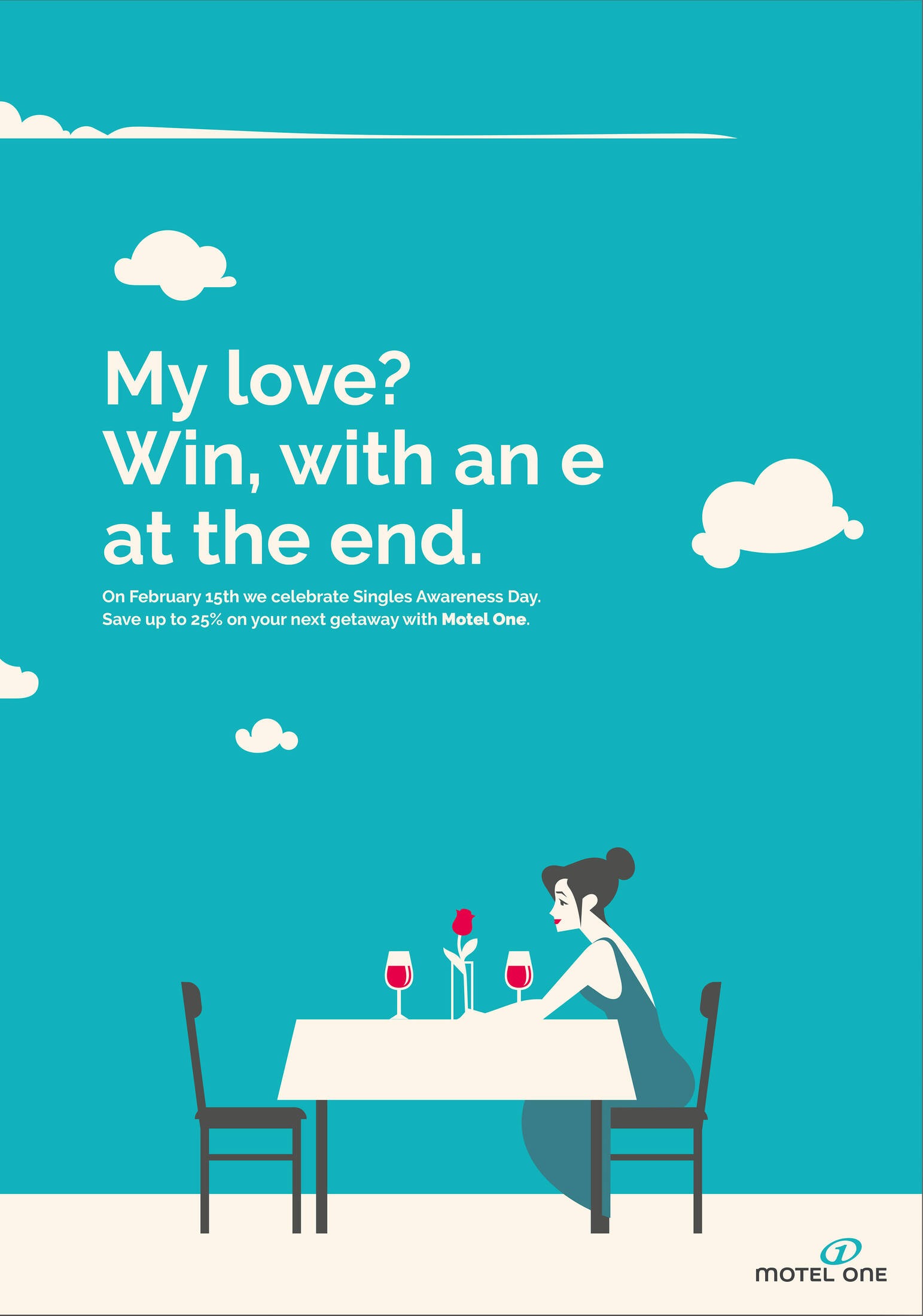Motel One offers a discount for single rooms on this special holiday. To spread the word, this print ad series portrays singledom through funny headlines and minimal illustrations to demonstrate how perfectly okay it is to be alone sometimes.