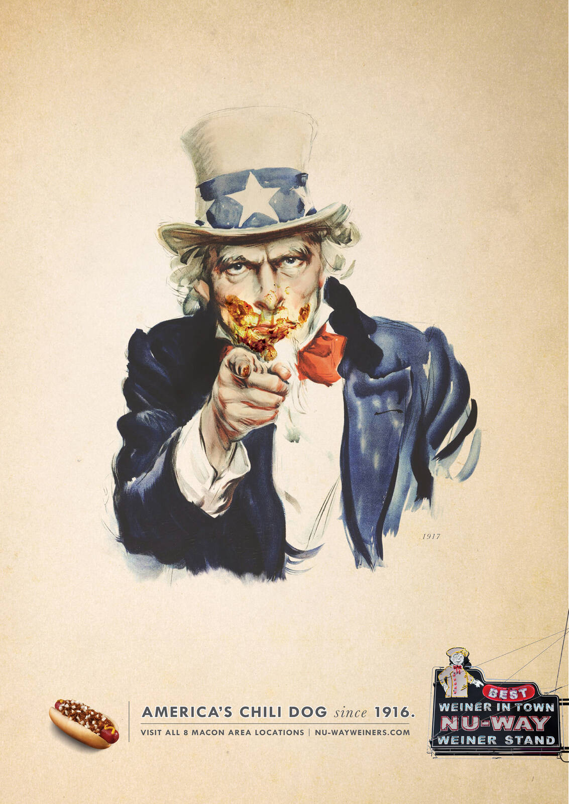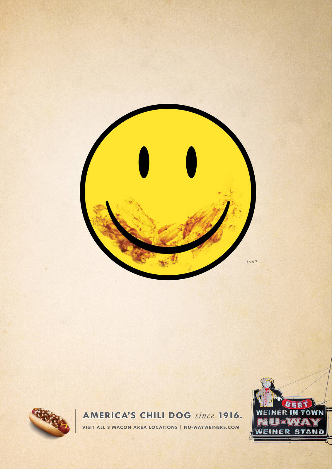 This professional campaign titled 'Smiley Face, Emoticon, Kilroy, Uncle Sam' was published in United States in May, 2012. It was created for the brand: Nu-Way Weiners, by ad agency: Brunner. This Print medium campaign is related to the Food industry and contains 4 media assets. It was submitted over 13 years ago.