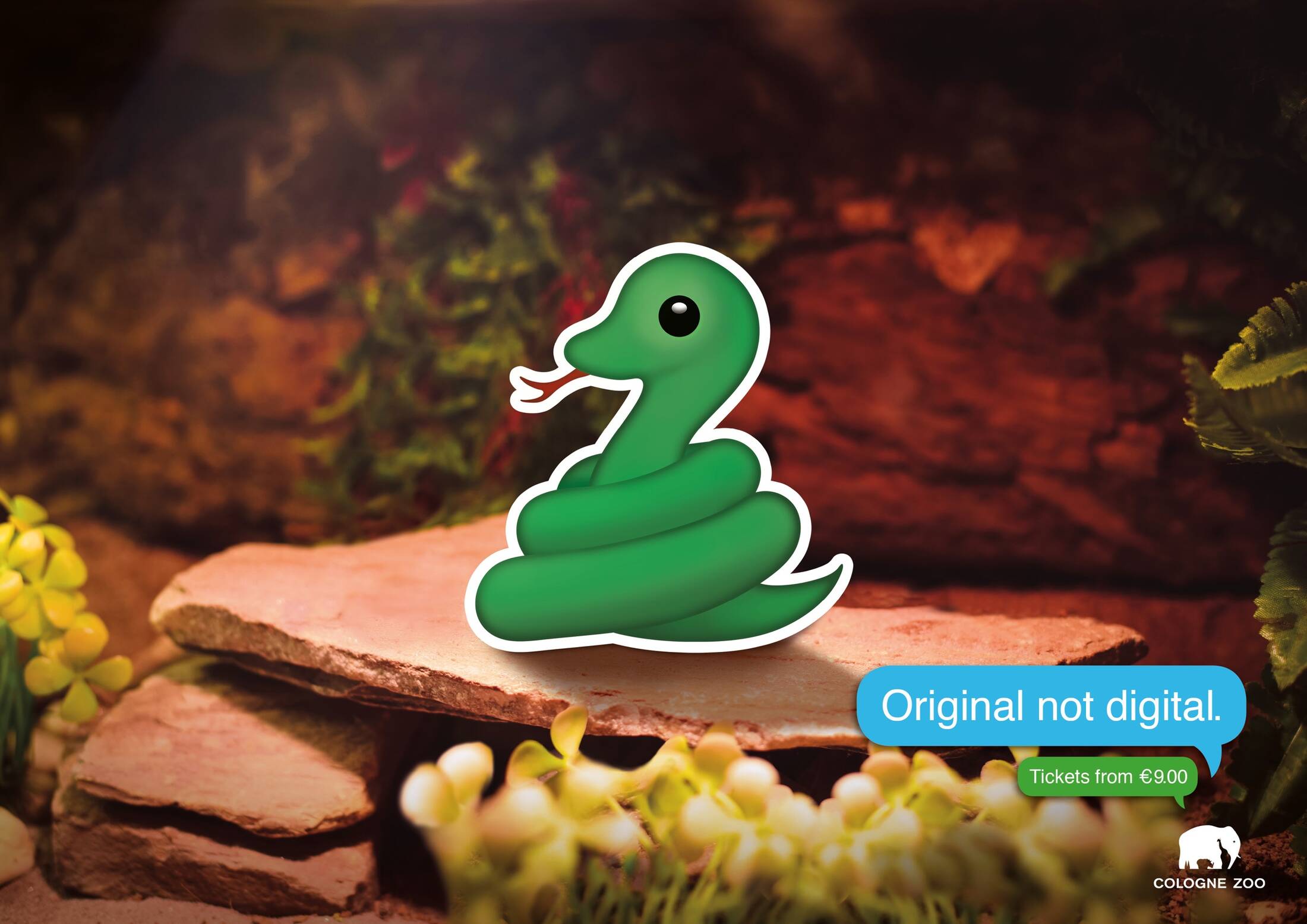 This professional campaign titled 'Snake, Elephants, Monkeys' was published in Germany in March, 2016. It was created for the brand: Cologne Zoo, by ad agency: Preuss und Preuss. This Print medium campaign is related to the Recreation, Leisure industry and contains 3 media assets. It was submitted over 9 years ago.