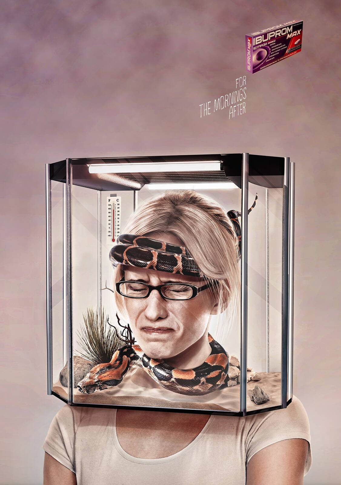This professional campaign titled 'Snake, Woodpeckers' was published in Ukraine in August, 2012. It was created for the brand: Ibuprom, by ad agency: Kaffeine. This Print medium campaign is related to the Pharmaceutical industry and contains 2 media assets. It was submitted about 13 years ago.