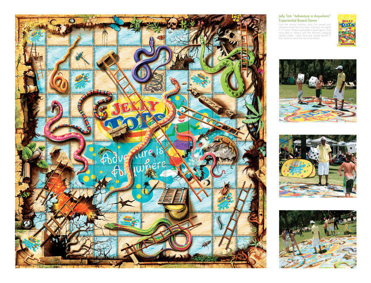This professional campaign titled 'Snakes and ladders' was published on December 01, 2007. It was created for the brand: Jelly Tots, by ad agency: TBWA\Hunt\Lascaris. This Ambient medium campaign is related to the Confectionery, Snacks industry and contains 1 media asset. It was submitted almost 18 years ago.