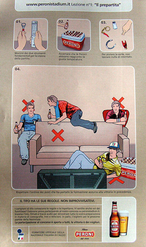 Peroni, an italian beer. The ad shows how to drink peroni while watching soccer on tv (soccer is the most famous sport in italy).