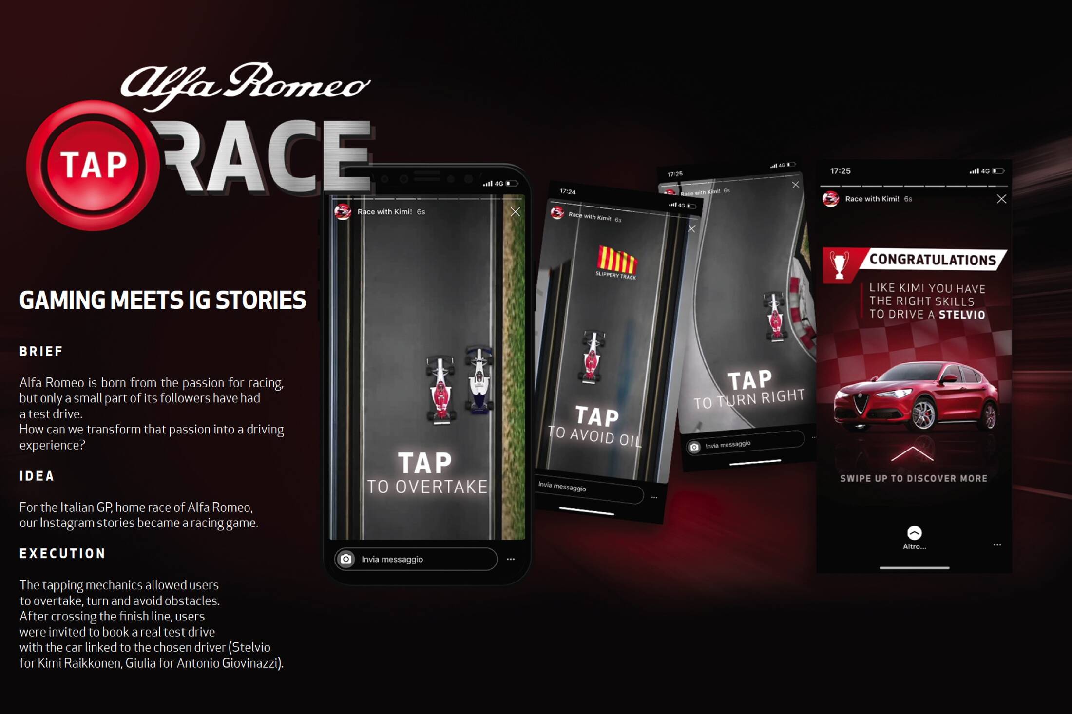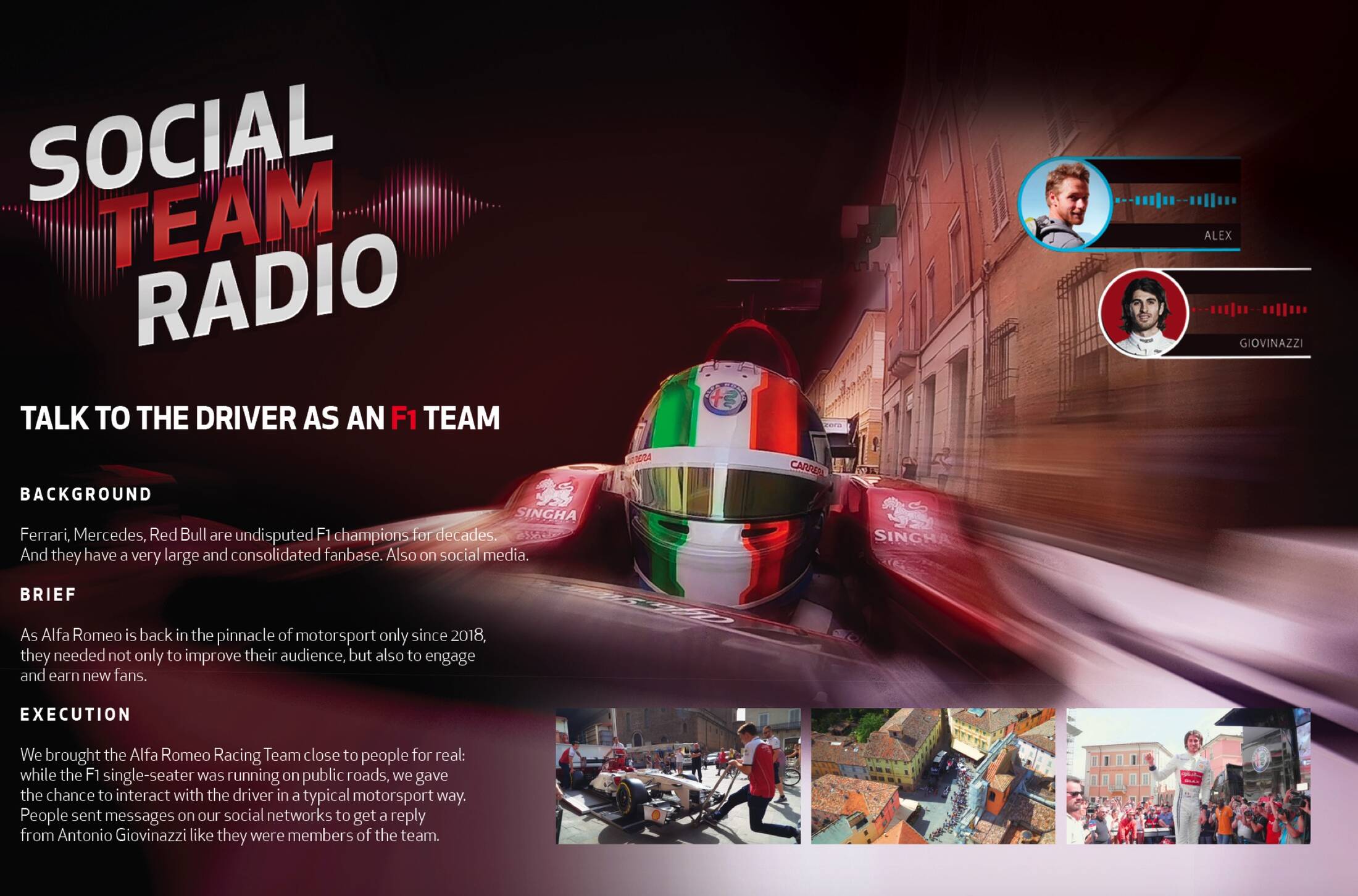 This professional campaign titled 'Social Team Radio, Alfa Romeo Tap Race' was published in Italy in July, 2019. It was created for the brand: Alfa Romeo, by ad agency: WPP. This Digital medium campaign is related to the Automotive and Personal Transportation industry and contains 4 media assets. It was submitted almost 6 years ago by Global Head of Social Automotive: Danielantonio Di Palma of Motorsport Network.