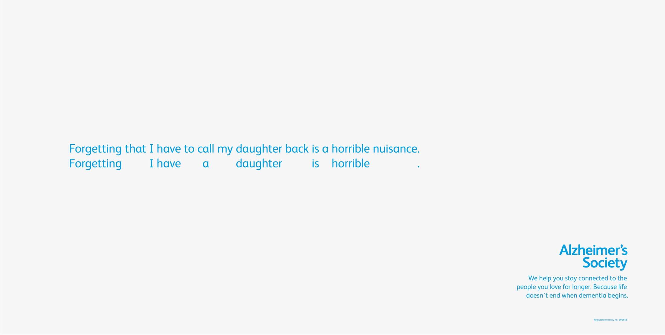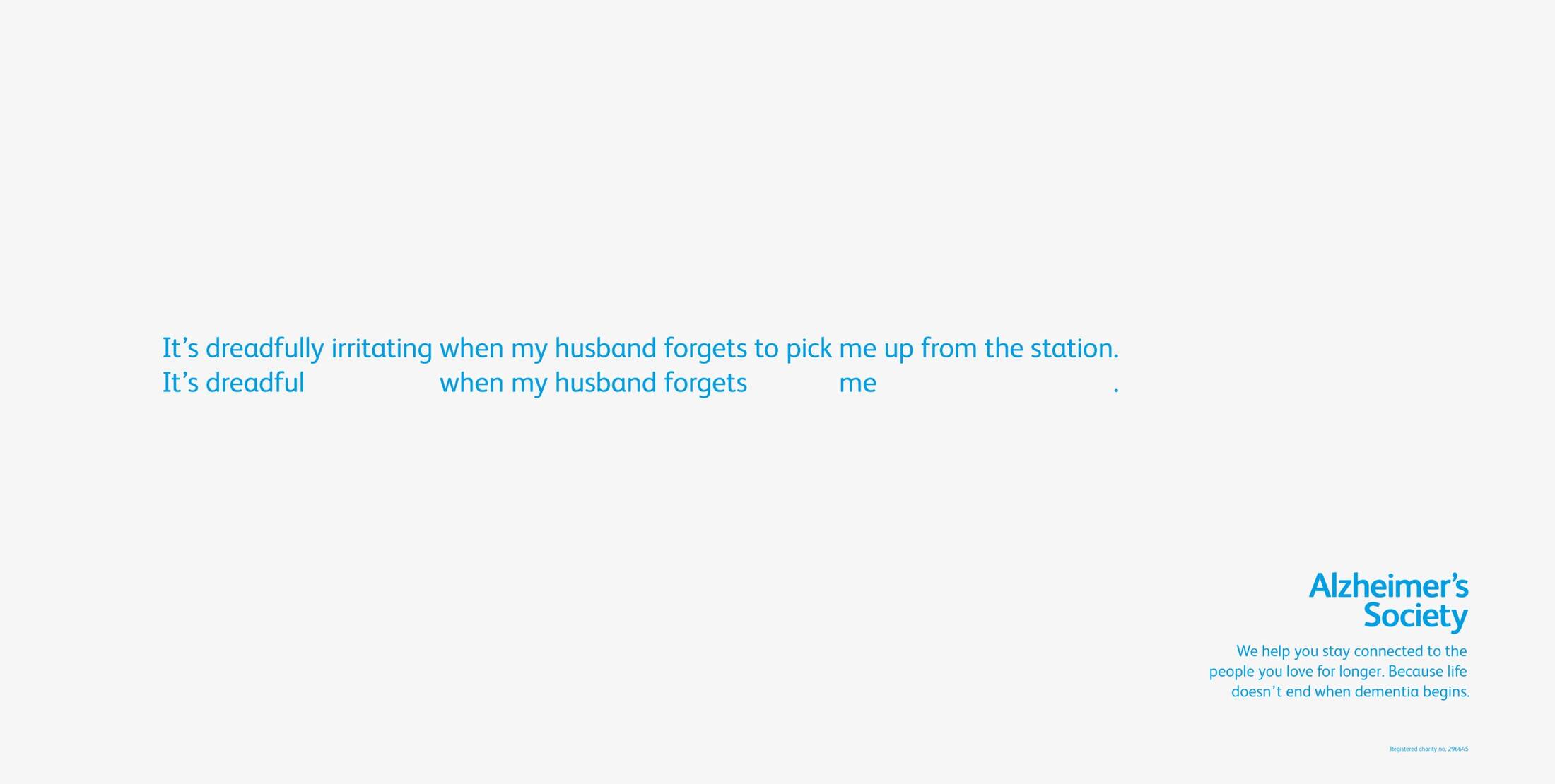This professional campaign titled 'Son, Daughter, Husband' was published in United Kingdom in May, 2015. It was created for the brand: Alzheimer's Society, by ad agency: Fallon. This OOH Outdoor medium campaign is related to the Public Interest industry and contains 3 media assets. It was submitted over 10 years ago.