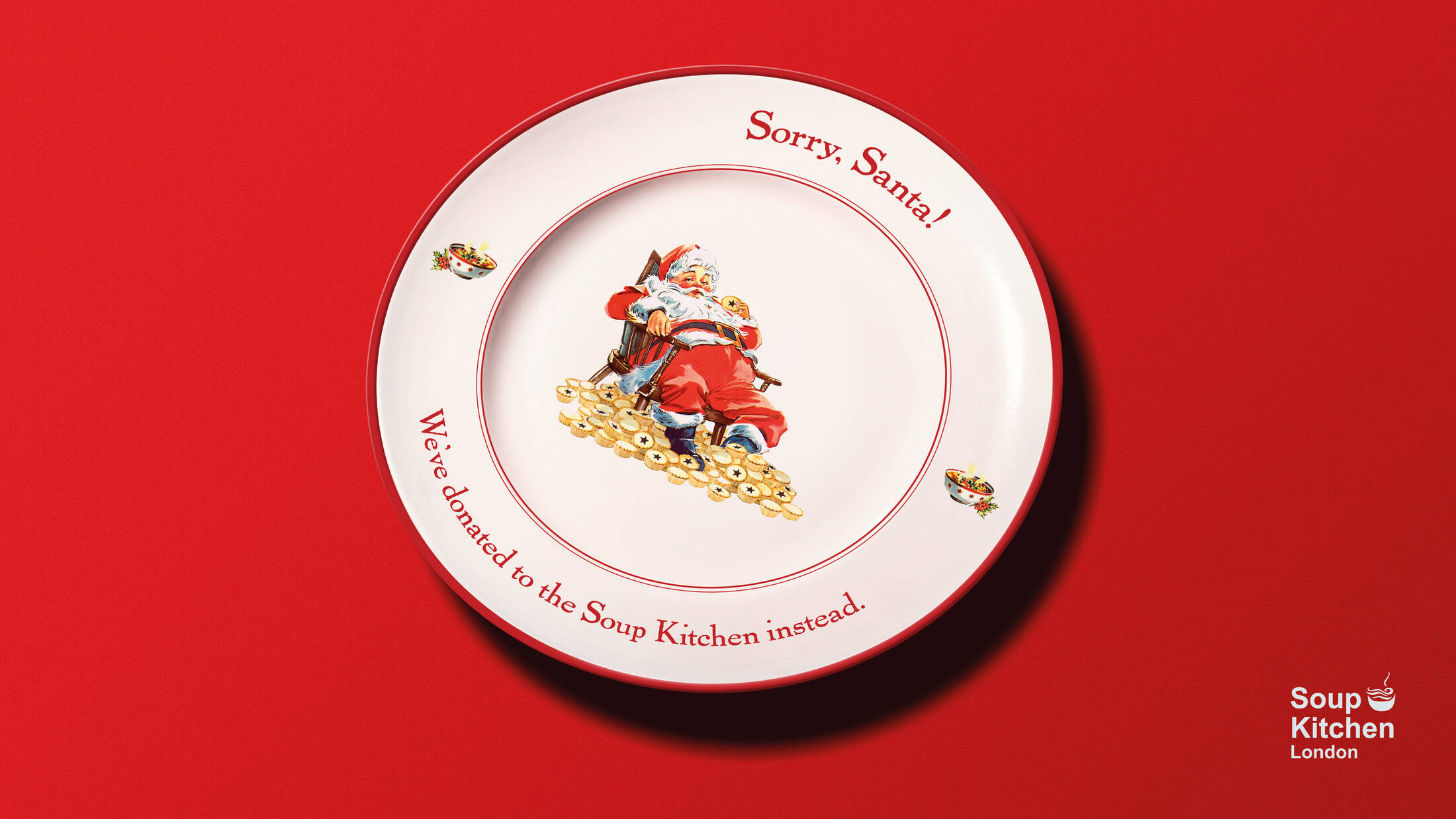 At the heart of the campaign is a kitsch, Christmassy ceramic plate emblazoned with the words ‘Sorry, Santa, we’ve donated to Soup Kitchen instead’. Designed to sit where the mince pie and sherry would usually be left on Christmas Eve, the plate replaces a familiar festive ritual with a prompt to donate, reframing generosity towards people in real need.