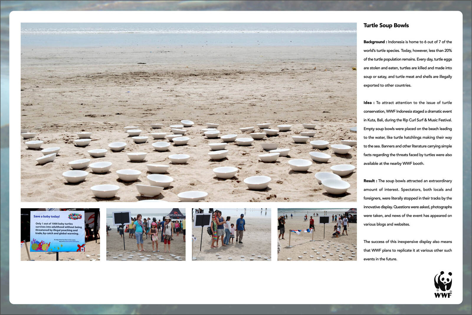 This professional campaign titled 'Soup' was published in Indonesia in October, 2008. It was created for the brand: WWF, by ad agency: Advantage. This Ambient medium campaign is related to the Public Interest industry and contains 1 media asset. It was submitted about 17 years ago.