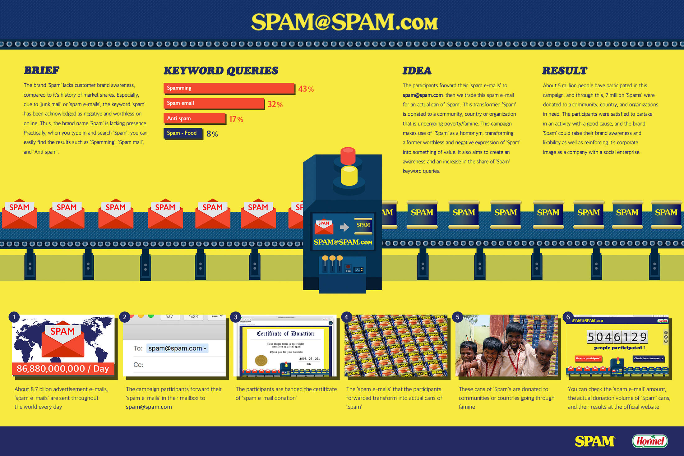 This student campaign titled 'Spam@spam.com Campaign' was published in South Korea in May, 2017. It was created for the brand: SPAM, by ad school: Sungkyunkwan University. This Integrated medium campaign is related to the Food industry and contains 1 media asset. It was submitted about 8 years ago.