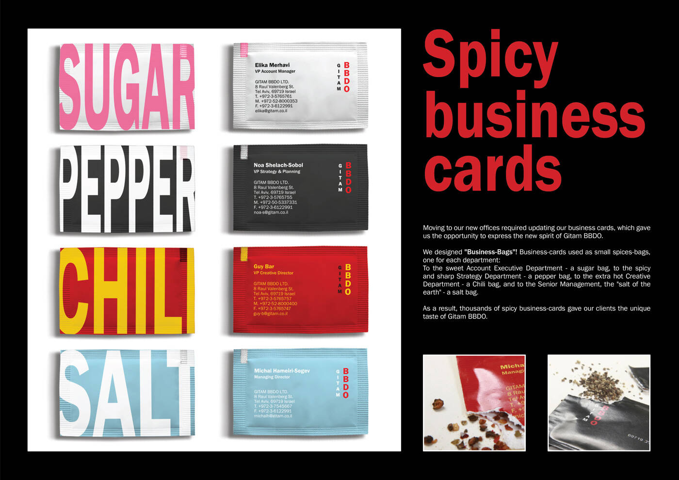 This professional campaign titled 'Spicy Business Cards' was published in Israel in May, 2010. It was created for the brand: BBDO, by ad agency: BBDO. This Static Images medium campaign is related to the Agency Self-Promo industry and contains 1 media asset. It was submitted over 15 years ago.