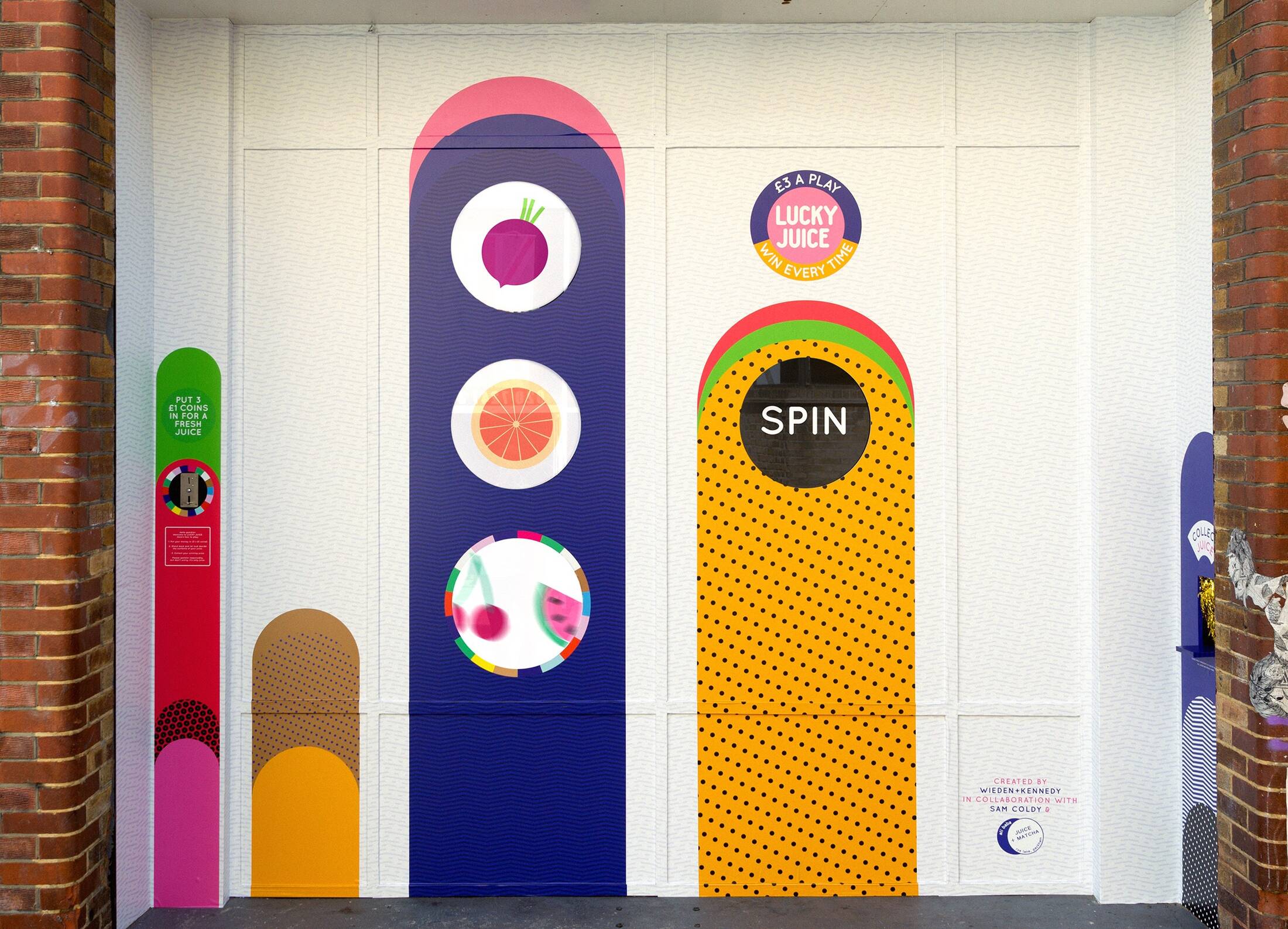 The Lucky Juice machine will dispense special blends to passers by via a colourful game of chance. Visitors simply insert 3 x £1 coins into the machine in exchange for a spin. Every spin is a winner, but luck will decide the fresh and fruity results – animated spinning wheels pick a combination of three sometimes surprising ingredients – which are hand delivered through the window in a glass bottle. With visuals inspired by fruit machine imagery, the installation puts a fun new spin on making a healthy choice. All juices are made from 100% natural ingredients and blended fresh at the Shoreditch location each day. Fans can share the juicy fun by tagging @wkluckyjuice on Instagram and Twitter.