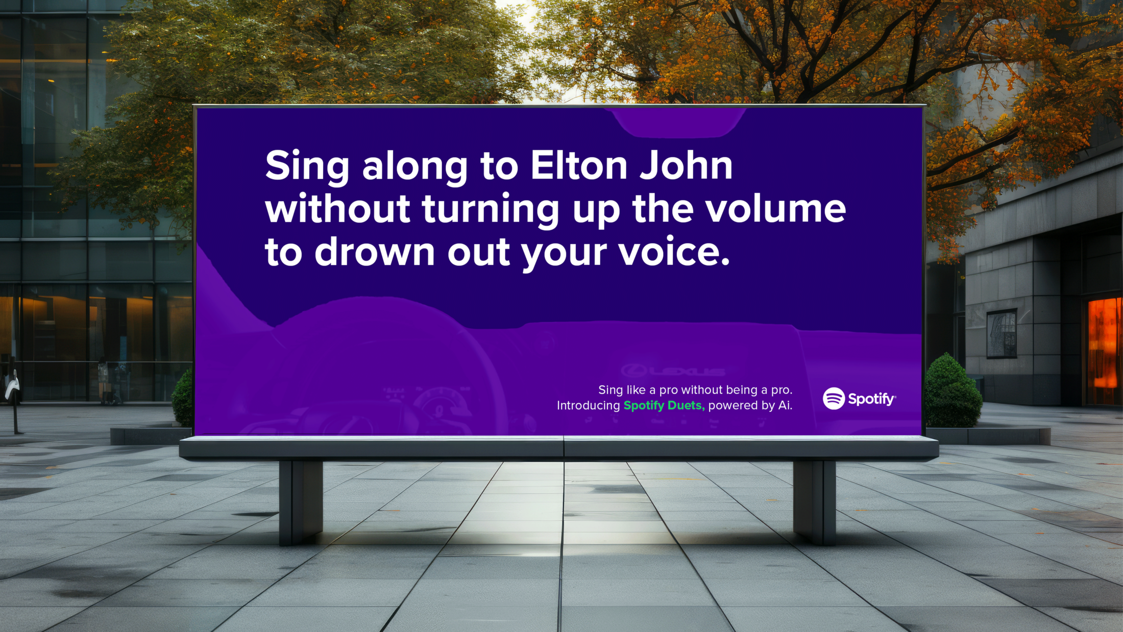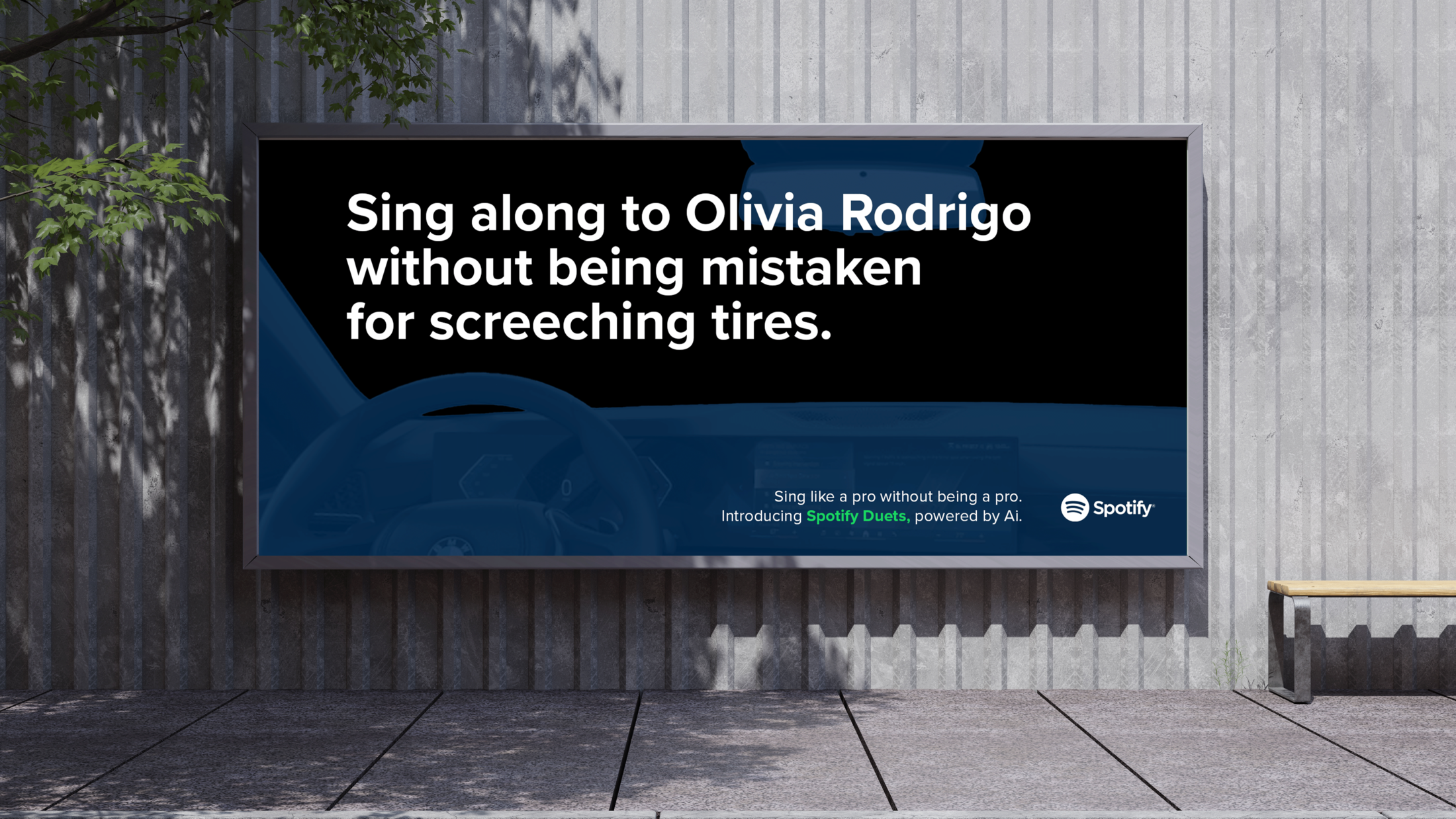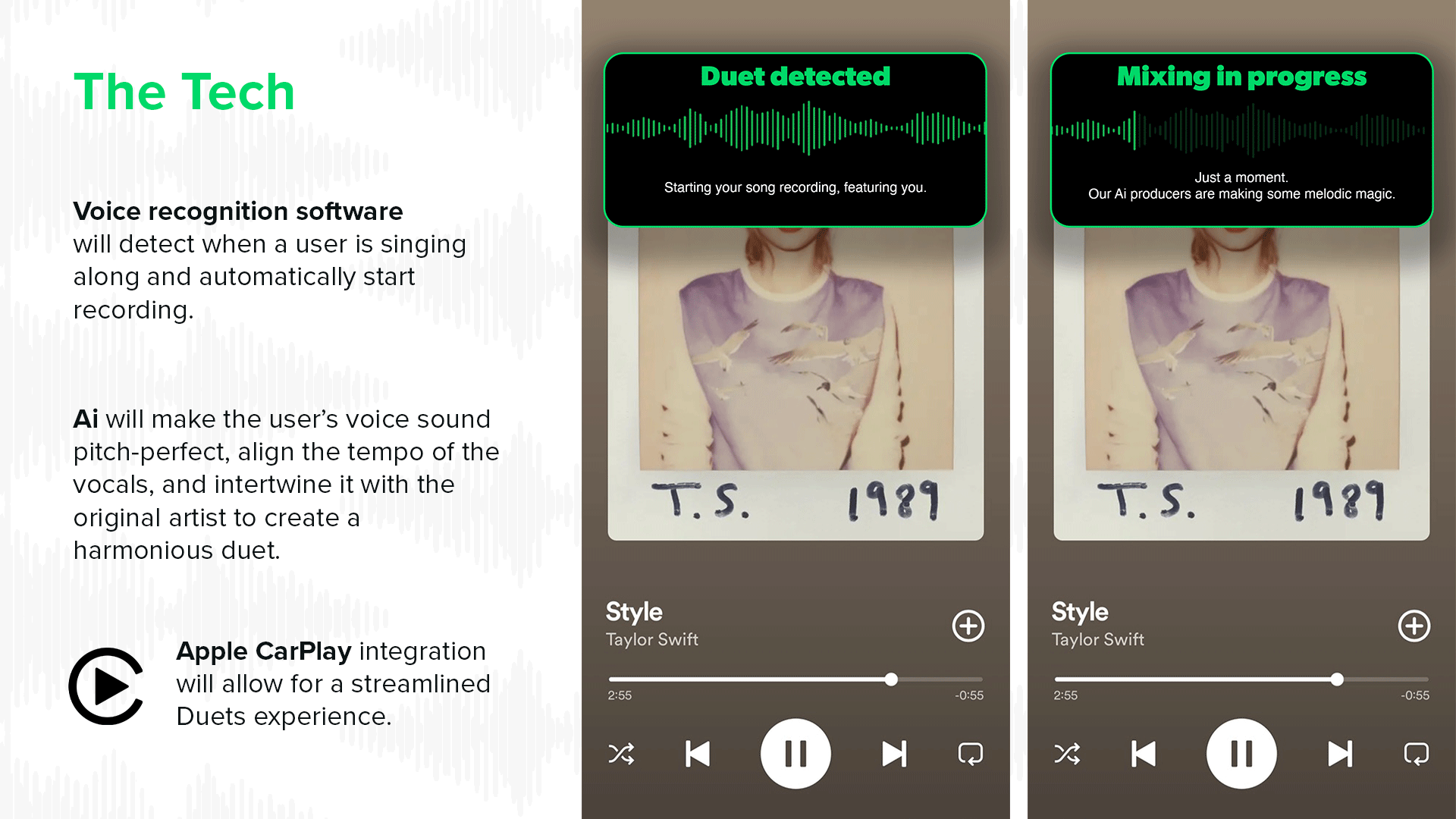 People often love to sing in the car, but they don't sound that good. With Spotify Duets, you can sing like a pro without being a pro. Voice recognition will detect when a user is singing along to a song, and Ai will record and generate a pitch-perfect duet with the original artist.