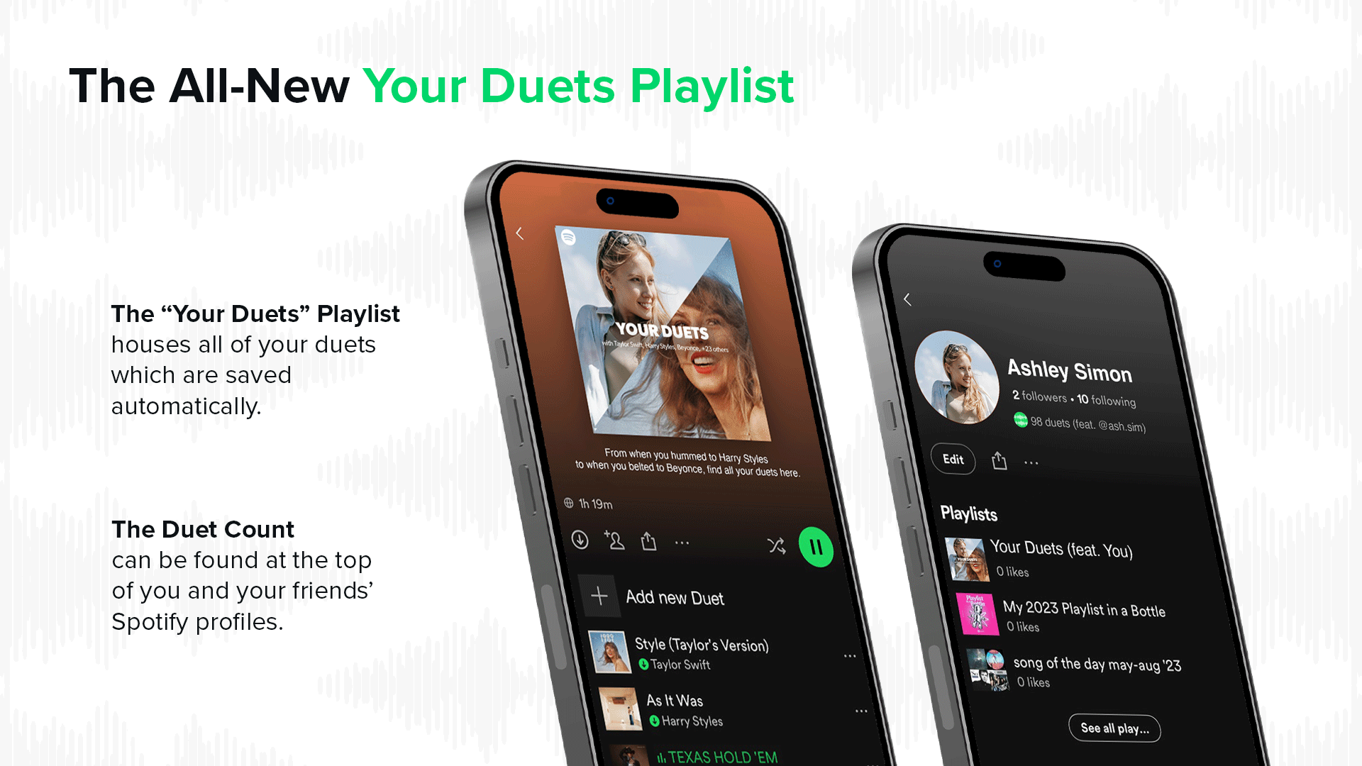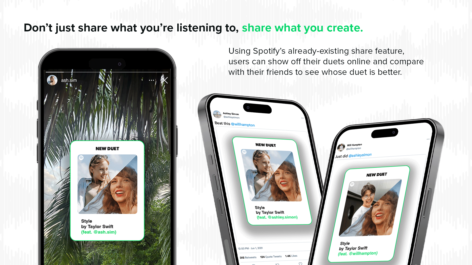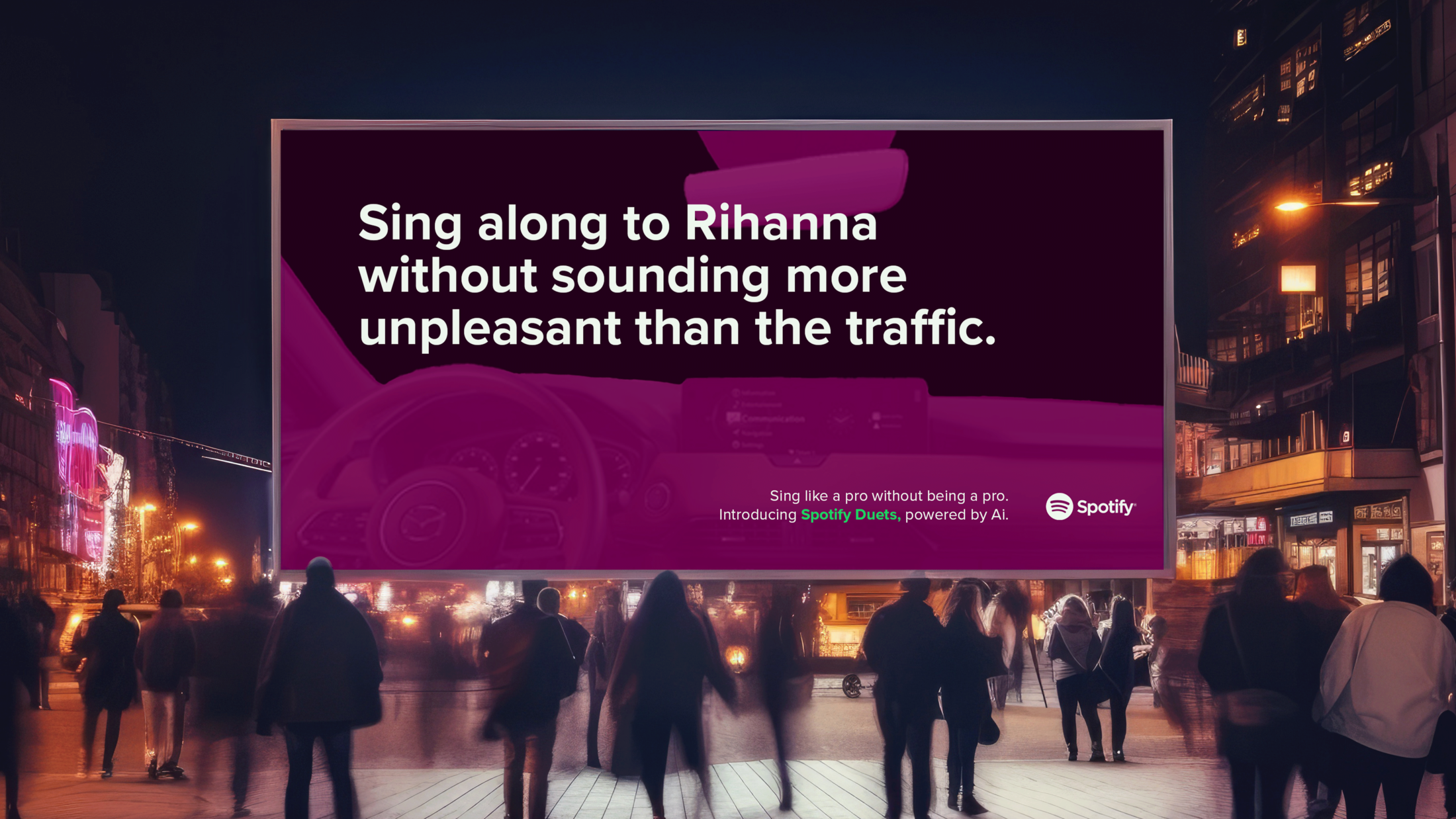 People often love to sing in the car, but they don't sound that good. With Spotify Duets, you can sing like a pro without being a pro. Voice recognition will detect when a user is singing along to a song, and Ai will record and generate a pitch-perfect duet with the original artist.