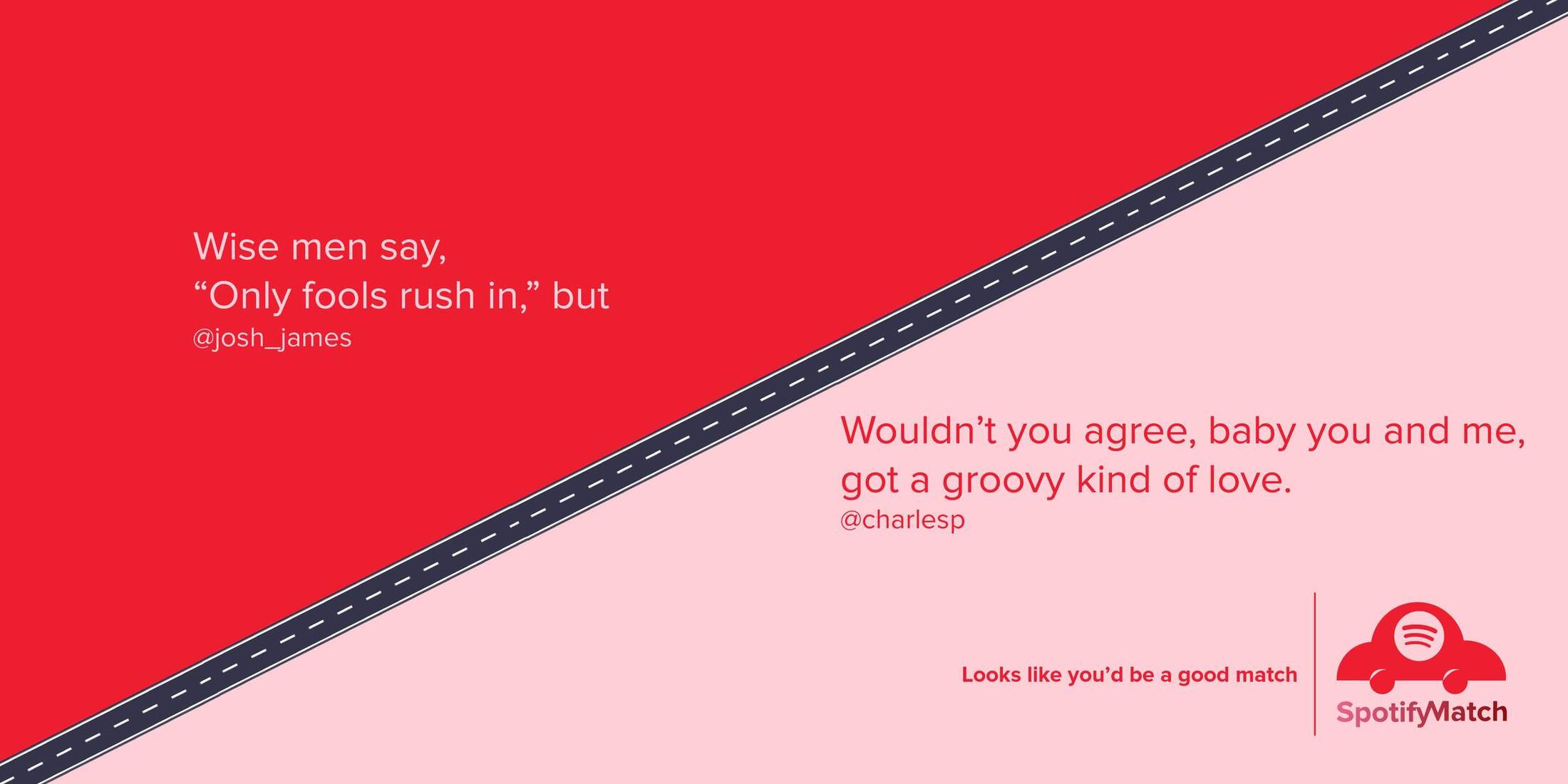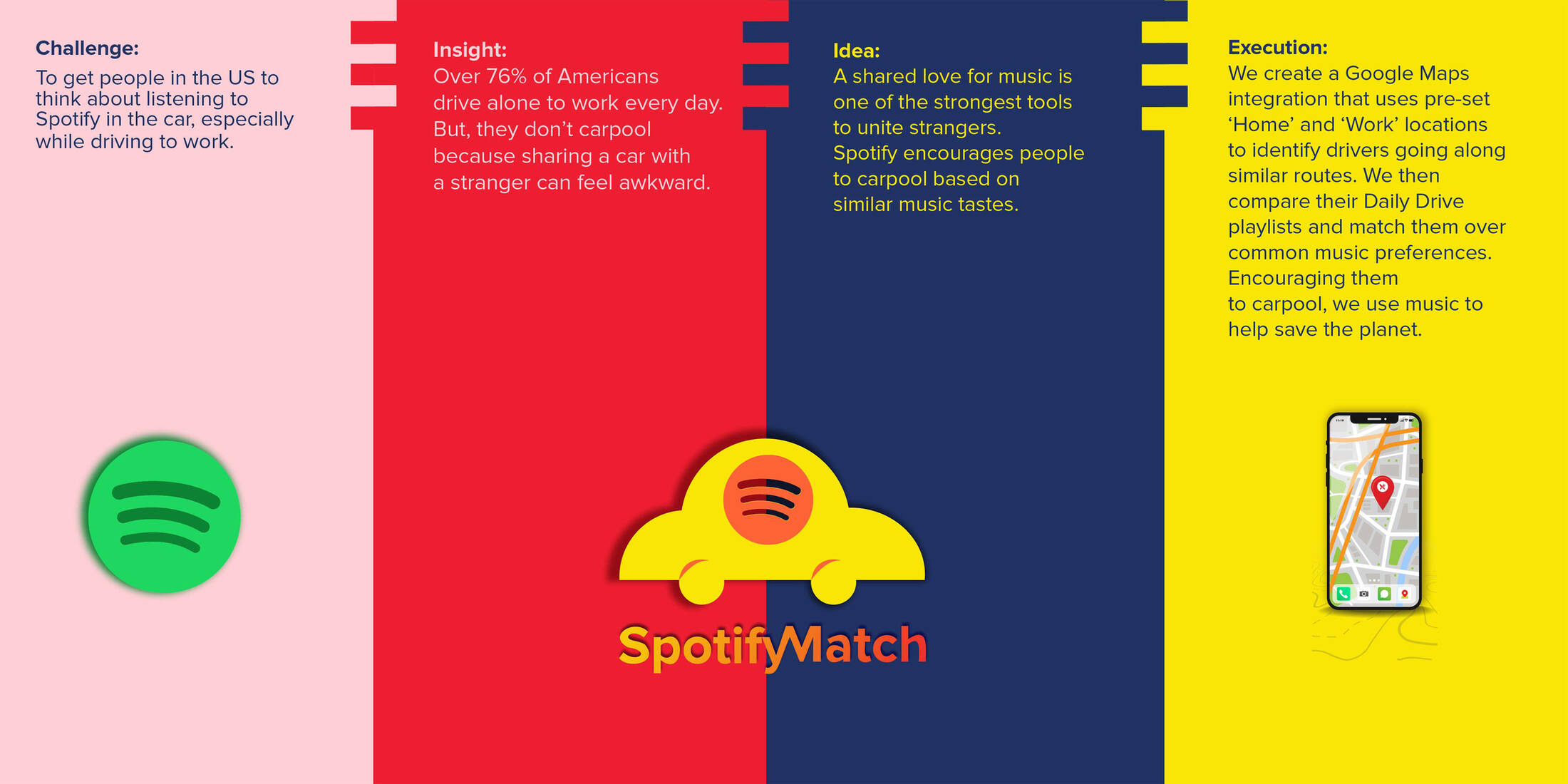 Over 76% of Americans drive alone to work every day. That's 115 millions cars on the road and accounts for one-third of the country’s air pollution. People don’t like to carpool because sharing a car with a stranger can feel awkward. And the planet bears the brunt of that. So we thought - what better way to connect strangers than a shared love for music? We create a Google Maps integration on Spotify that uses pre-set ‘Home’ and ‘Work’ locations to identify drivers going along similar routes. We then compare their Daily Drive playlists and match them over common music preferences. Encouraging them to carpool, we not only get them to listen to Spotify in the car but also use music to help save the planet.