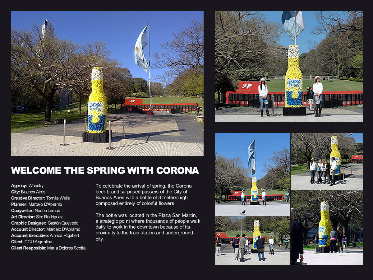 To celebrate the arrival of spring, the Corona beer brand surprised passers of the City of Buenos Aires with a bottle of 3 meters high composed entirely of colorful flowers. The bottle was located in the Plaza San Martín, a strategic point where thousands of people walk daily to work in the downtown because of its proximity to the train station and underground city.