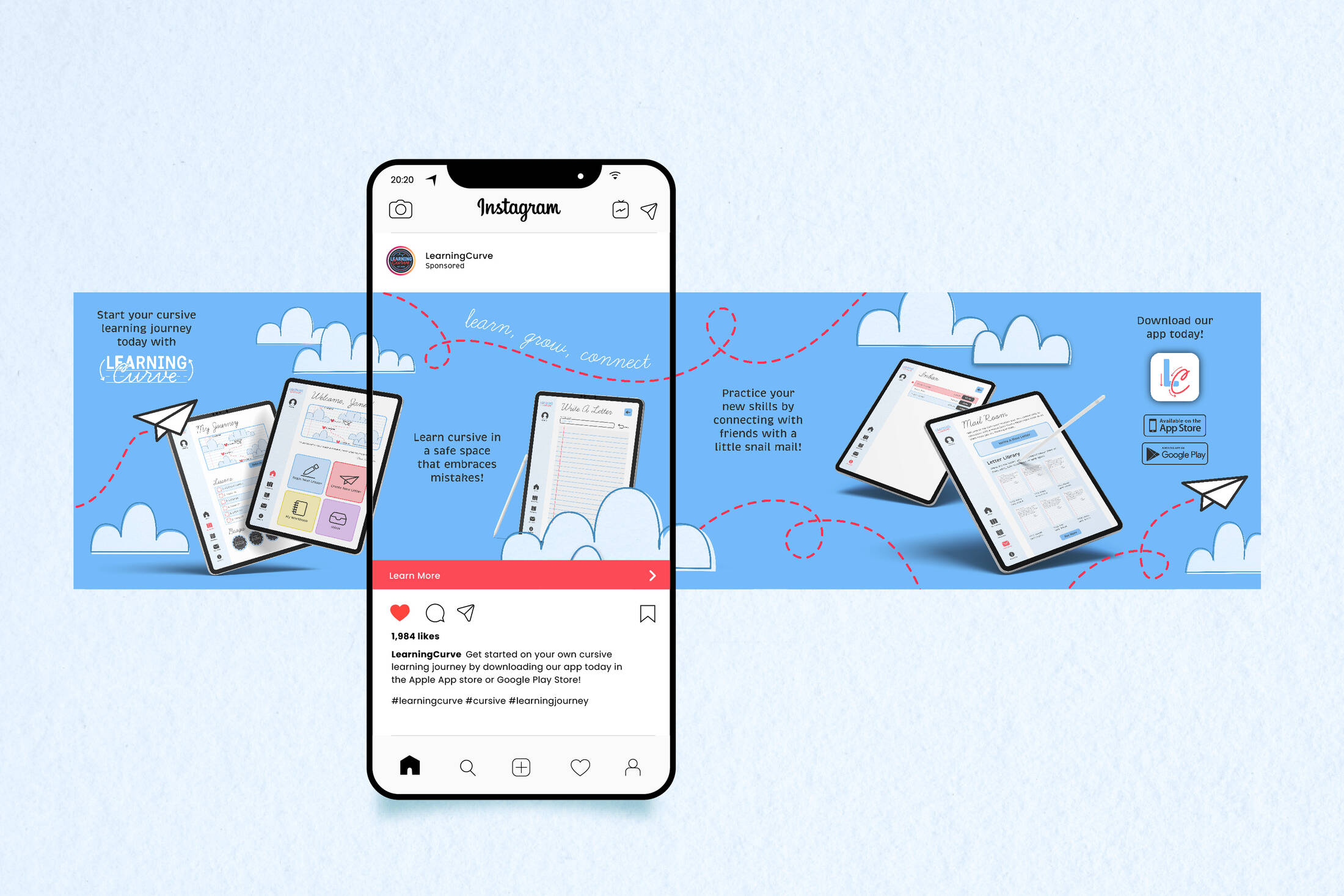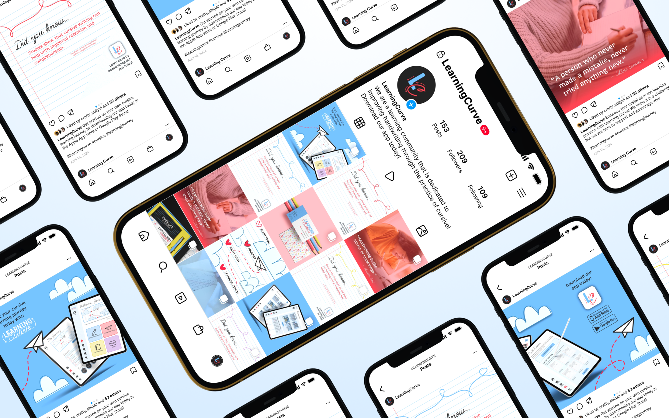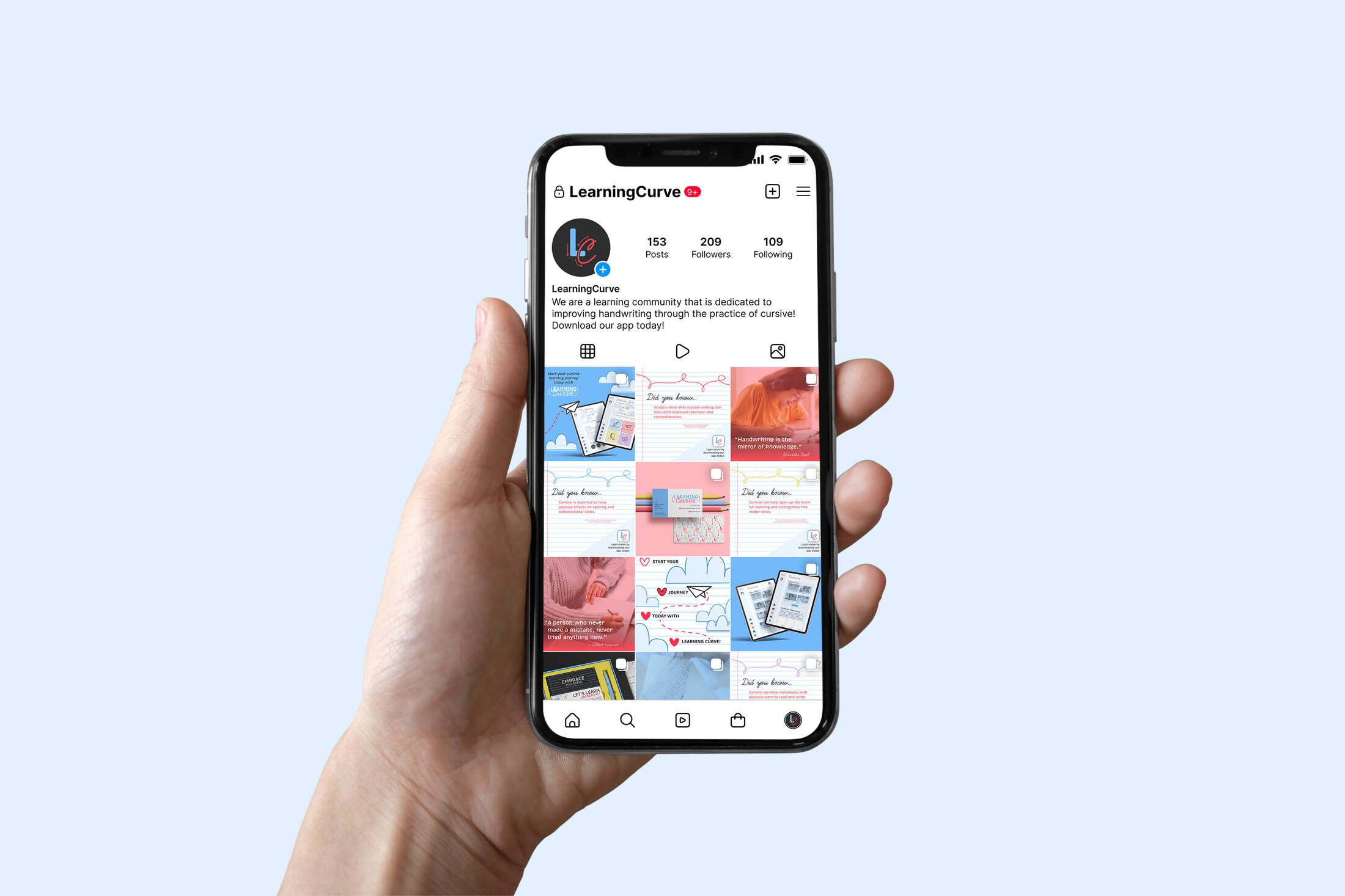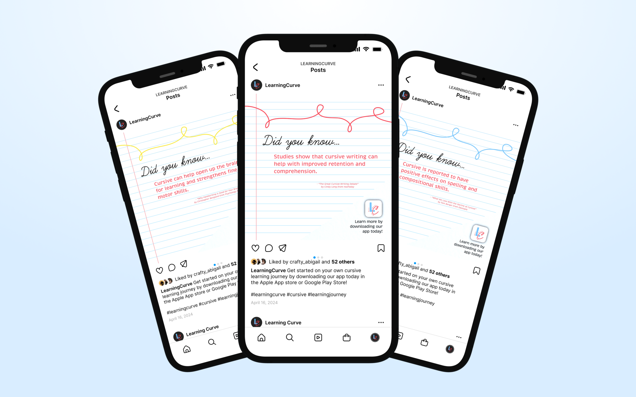 This social media series is made to compliment the Learning Curve brand and advertise the Learning Curve app which is a resource for learning cursive writing. These posts are meant to encourage potential users to download the app to start their own learning journey. They also highlight features of the app that make this a unique experience and a fun way to improve handwriting. There are also additional posts that are meant to teach the audience about the benefits of cursive writing that many individuals don't know about.