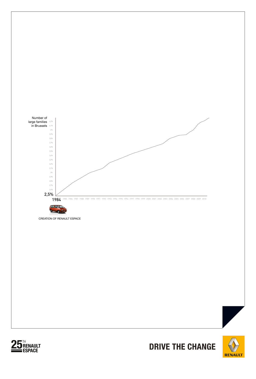This professional campaign titled 'Statistics, Large families, Statistics, Human size evolut...' was published in Belgium in November, 2010. It was created for the brand: Renault, by ad agency: Publicis. This Print medium campaign is related to the Automotive and Personal Transportation industry and contains 3 media assets. It was submitted about 15 years ago.