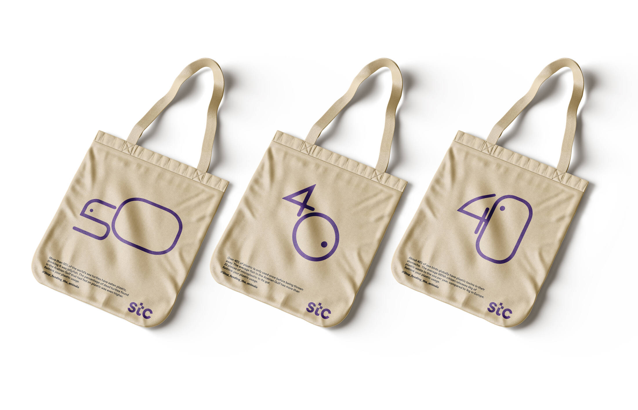 The illustrations on the reusable bags vividly depict alarming statistics concerning marine life and plastic pollution (40, 50 & 40). These numbers are ingeniously presented in the form of the marine animals commonly found in Bahraini waters, including fish, sea birds, and turtles.