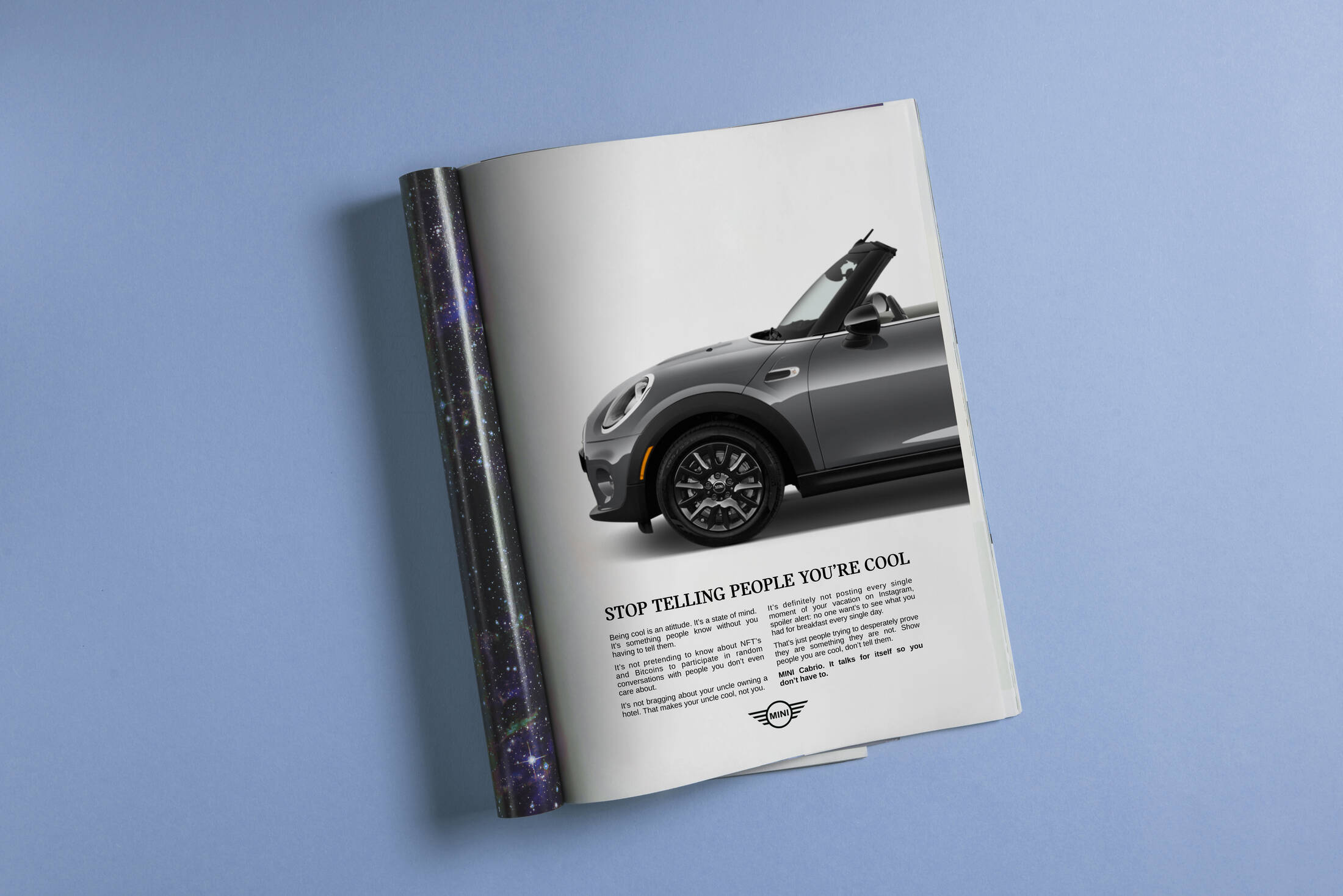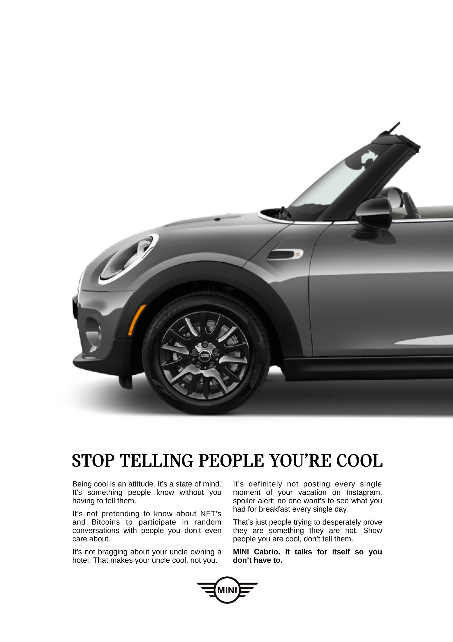 This student campaign titled 'Stop telling people you're cool' was published in Spain in September, 2022. It was created for the brand: Mini, by ad school: Miami Ad School. This Print medium campaign contains 2 media assets. It was submitted about 3 years ago by Art Director: Ilu Shilpakar of Dentsu Creative.