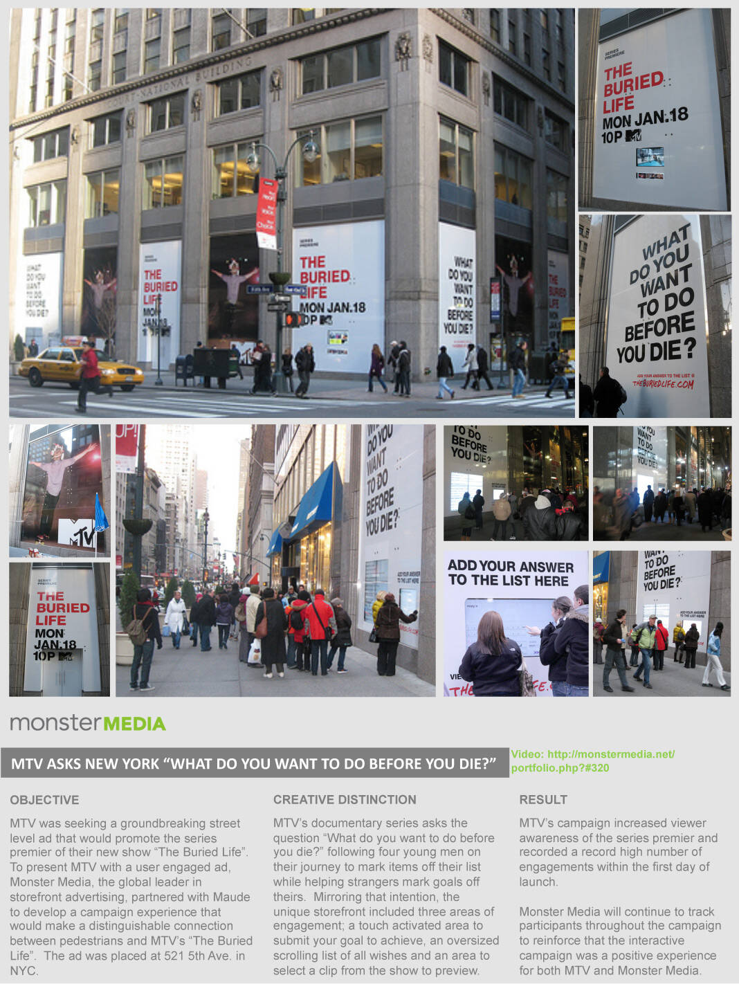 This professional campaign titled 'Storefront Domination' was published in United States in January, 2010. It was created for the brands: MTV and The Buried Life, by ad agency: Monster Media. This Ambient medium campaign is related to the Media industry and contains 1 media asset. It was submitted almost 16 years ago.