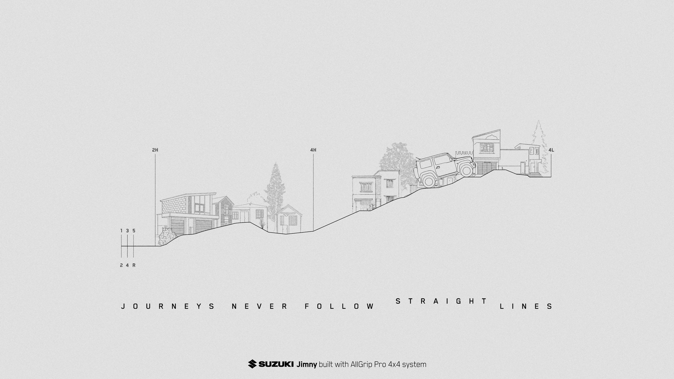 Real journeys rise, drop, and change in unexpected ways. Which is why we turned the landscape into an improvised shift diagram, showing how the Suzuki Jimny’s AllGrip Pro 4x4 system adapts to every challenge as it appears.