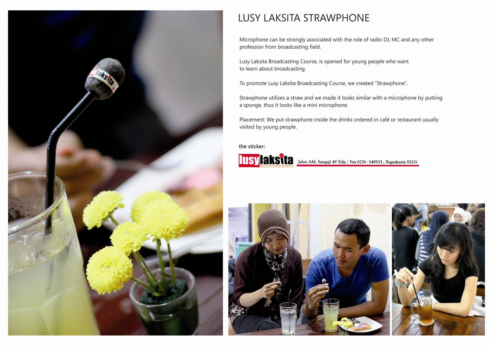 This professional campaign titled 'Strawphone' was published in Indonesia in September, 2010. It was created for the brand: Lusy Laksita Broadcsting School, by ad agency: Existcomm. This Static Images medium campaign is related to the Education industry and contains 1 media asset. It was submitted about 15 years ago.