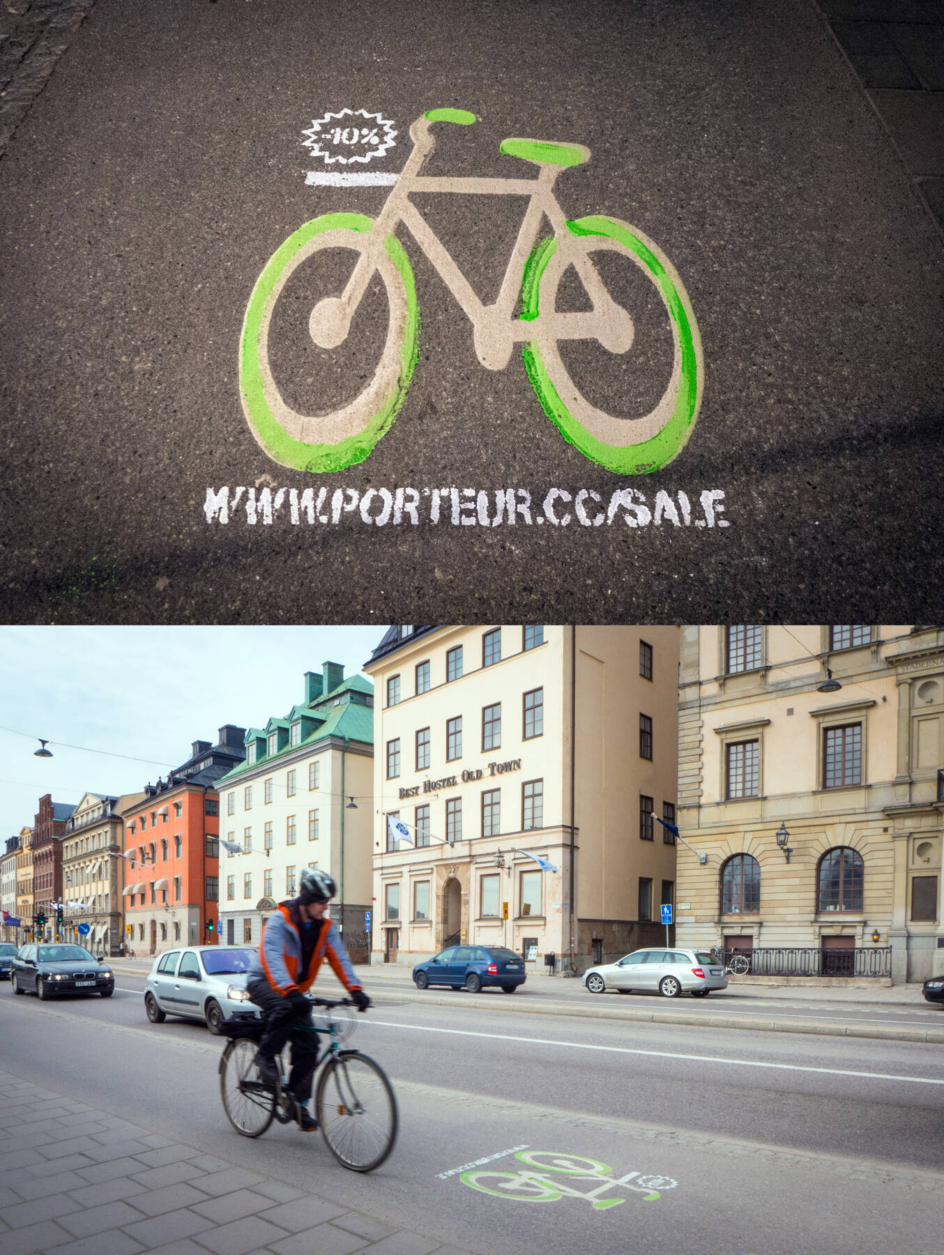 Porteur is a new bicycle brand with a characteristic and unique design. This morning, cyclists in Stockholm were surprised by the latest ad stunt from the brand. A new, unused media that cyclists unconsciously look for everyday was explored. Using water soluble paint, ads were made out of the road markings pointing out the bicycle lane. Those who visit the campaign site, www.porteur.cc/sale , receive a 10% discount on purchase. But you have to be quick - when the water soluble paint disappears, so does the discount.