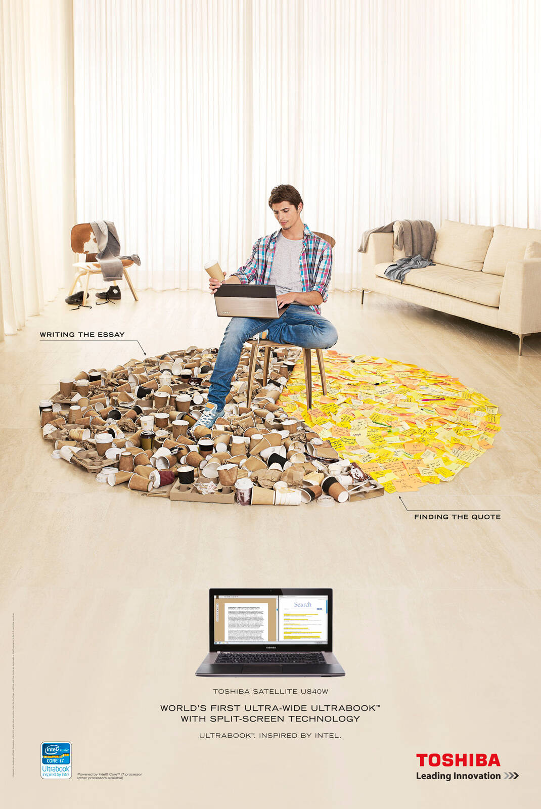This professional campaign titled 'Studying, Working, Shopping' was published in Australia in September, 2012. It was created for the brand: Toshiba, by ad agency: BBDO. This Print medium campaign is related to the Electronics, Technology industry and contains 3 media assets. It was submitted over 13 years ago.