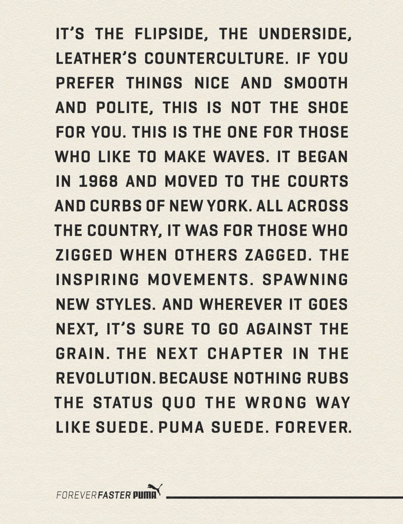 This professional campaign titled 'Suede Forever' was published in United States in April, 2016. It was created for the brand: Puma, by ad agency: JWT. This OOH Outdoor medium campaign is related to the Fashion industry and contains 8 media assets. It was submitted over 9 years ago.
