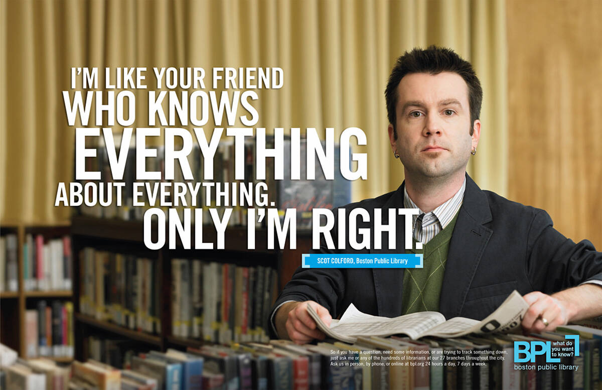 This professional campaign titled 'Summits, Face, Right' was published in United States in June, 2008. It was created for the brand: Boston Public Library, by ad agency: A&G. This Print medium campaign is related to the Professional Services industry and contains 3 media assets. It was submitted over 17 years ago.