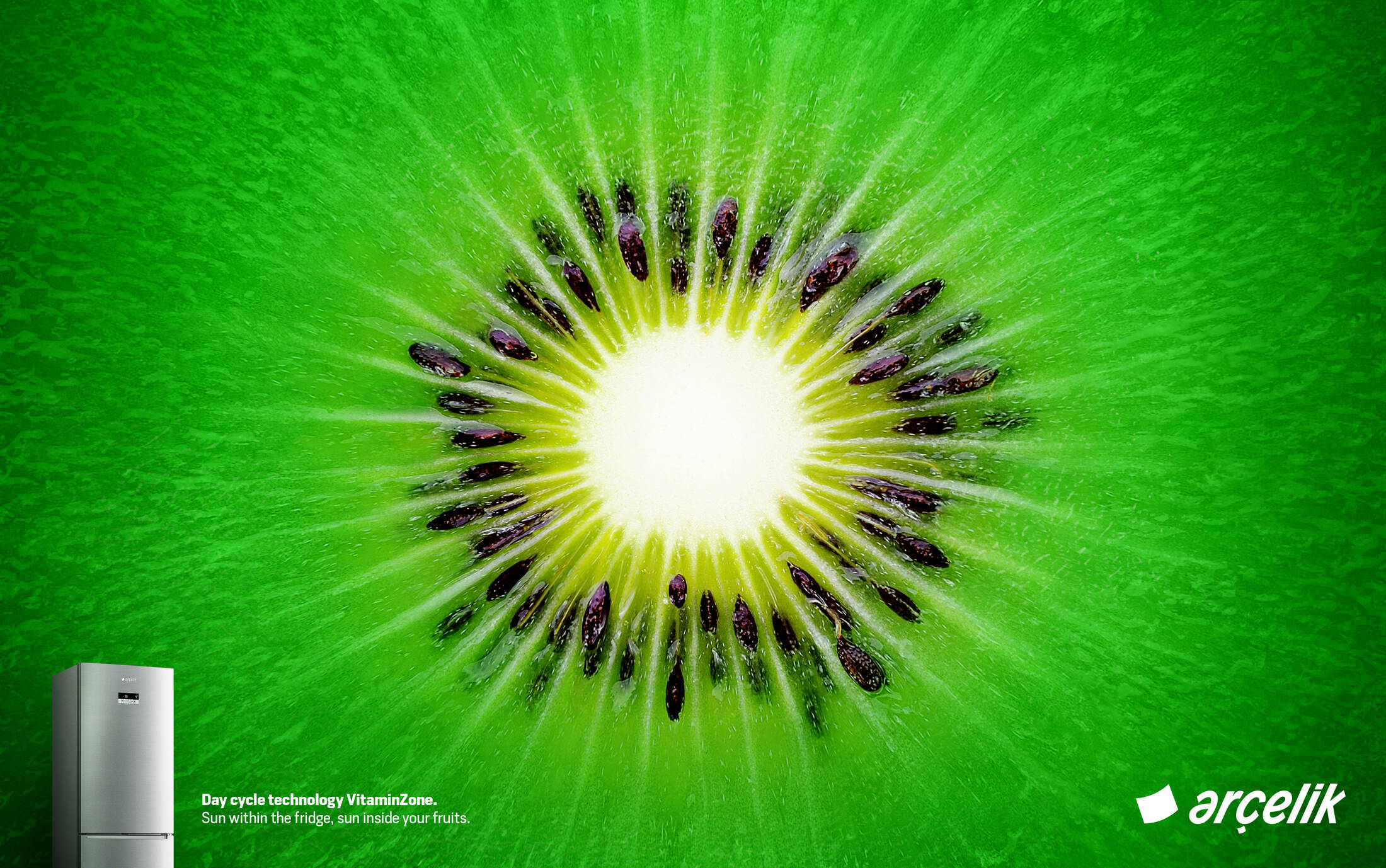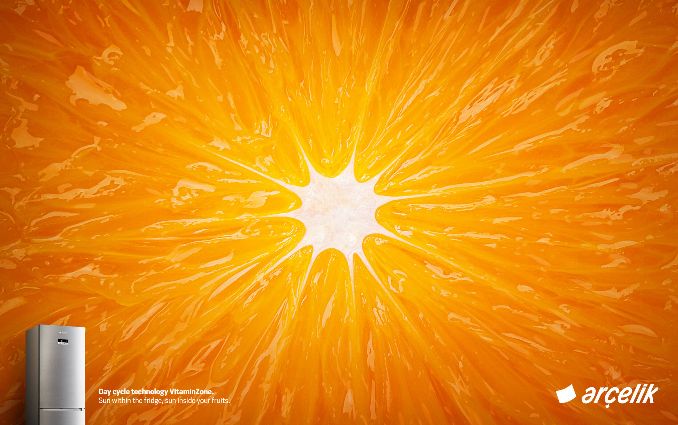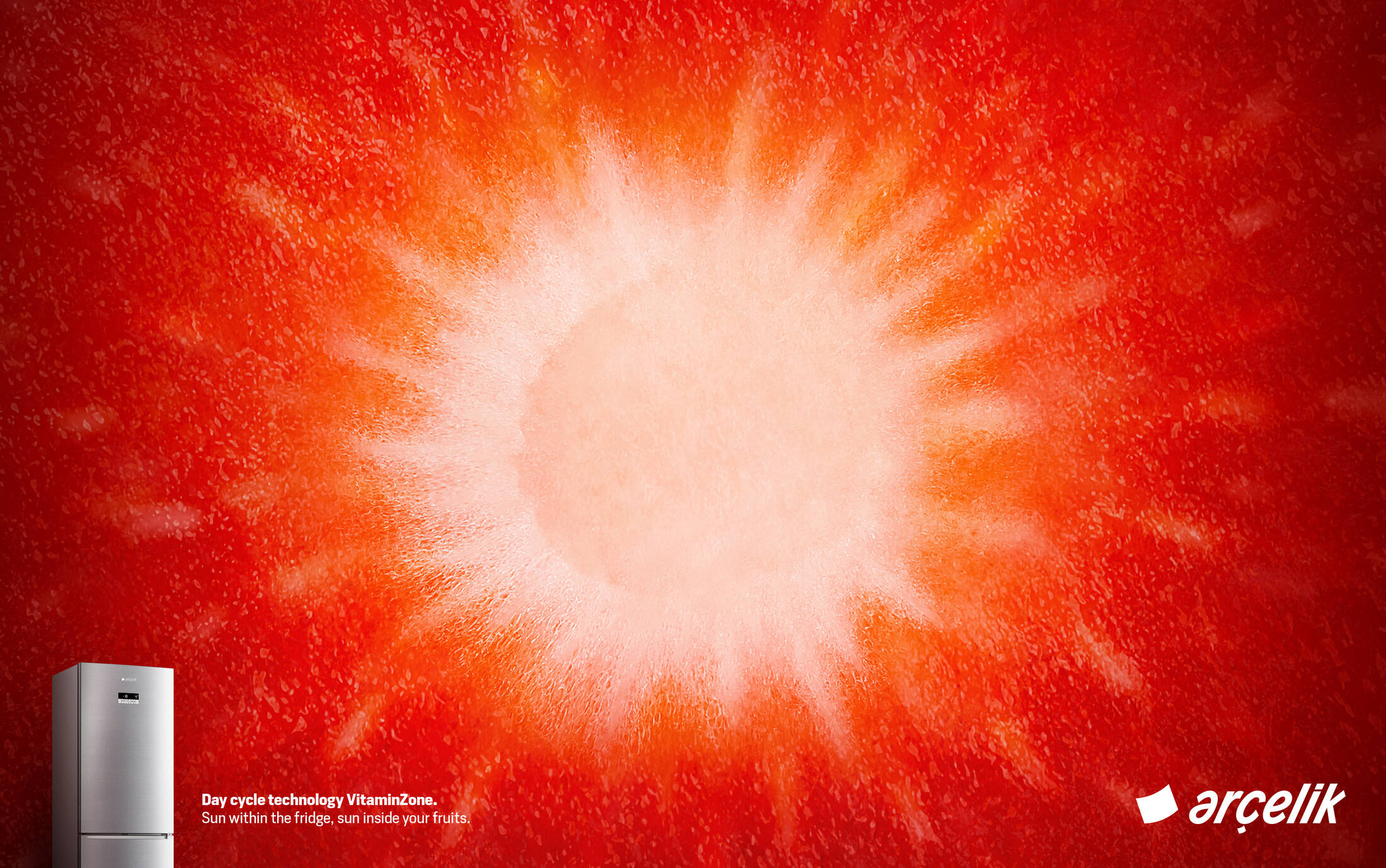 Arçelik VitaminZone preserves vitamins in fruits and vegetables by imitating daylight cycle of the sun in the fridge. We used visuals of fruit sections to represent the relation between the sun and a healthy fruit.