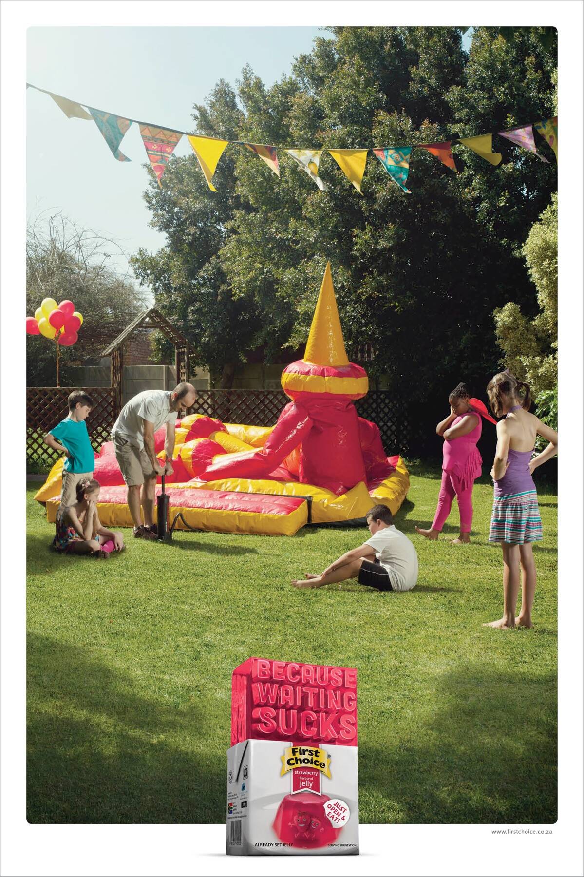 This professional campaign titled 'Supertube, Pool, Jumping Castle' was published in South Africa in December, 2012. It was created for the brand: First Choice Jelly, by ad agency: Boomtown. This Print medium campaign is related to the Confectionery, Snacks industry and contains 3 media assets. It was submitted almost 13 years ago.