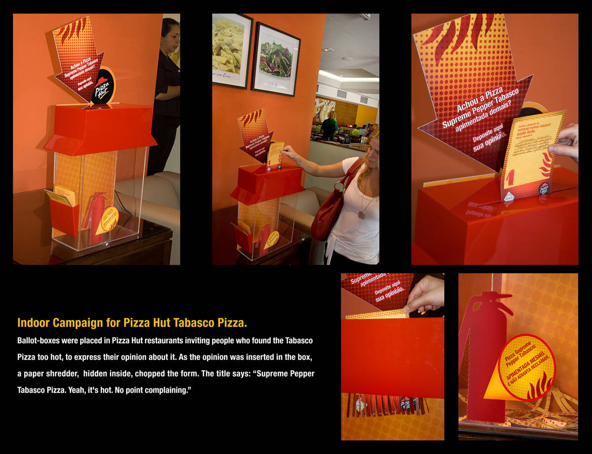 This professional campaign titled 'Supreme Pepper Tabasco Pizza' was published in Brazil in February, 2008. It was created for the brand: Pizza Hut, by ad agency: Dim Propaganda. This Ambient medium campaign is related to the Food industry and contains 1 media asset. It was submitted almost 18 years ago.