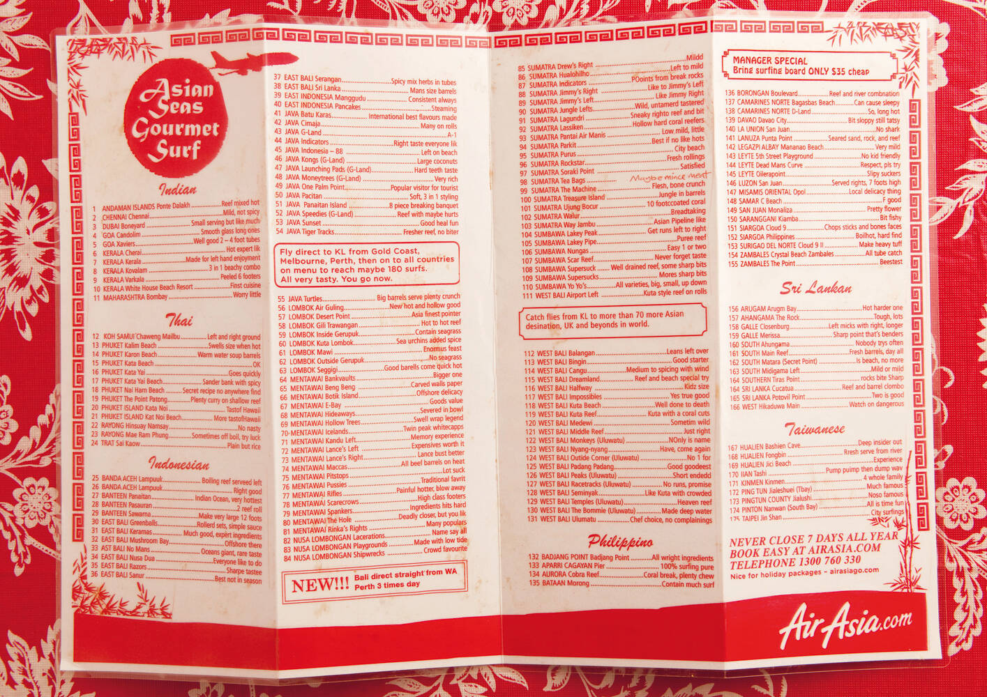 This professional campaign titled 'Surf Menu' was published in Australia in September, 2010. It was created for the brand: Air Asia, by ad agency: Publicis. This Print medium campaign is related to the Transport industry and contains 1 media asset. It was submitted about 15 years ago.