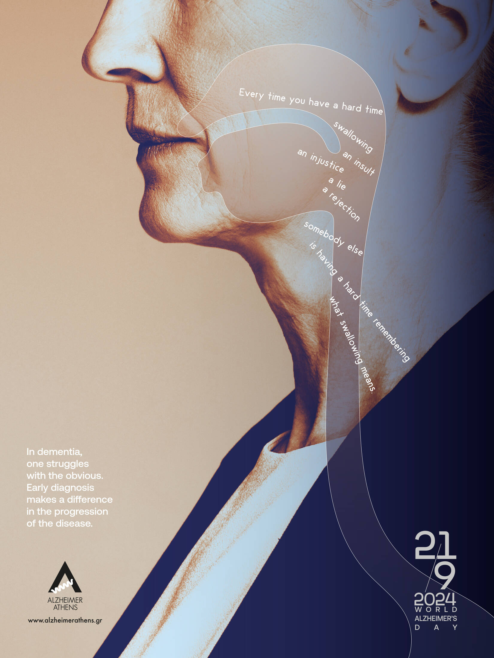 This professional campaign titled 'SWALLOWING' was published in Greece in September, 2024. It was created for the brand: Alzheimer Athens, by ad agency: Out to Lunch. This Digital and Print media campaign is related to the Public Interest industry and contains 1 media asset. It was submitted about 1 year ago by stilianaki: anna of Out to Lunch.