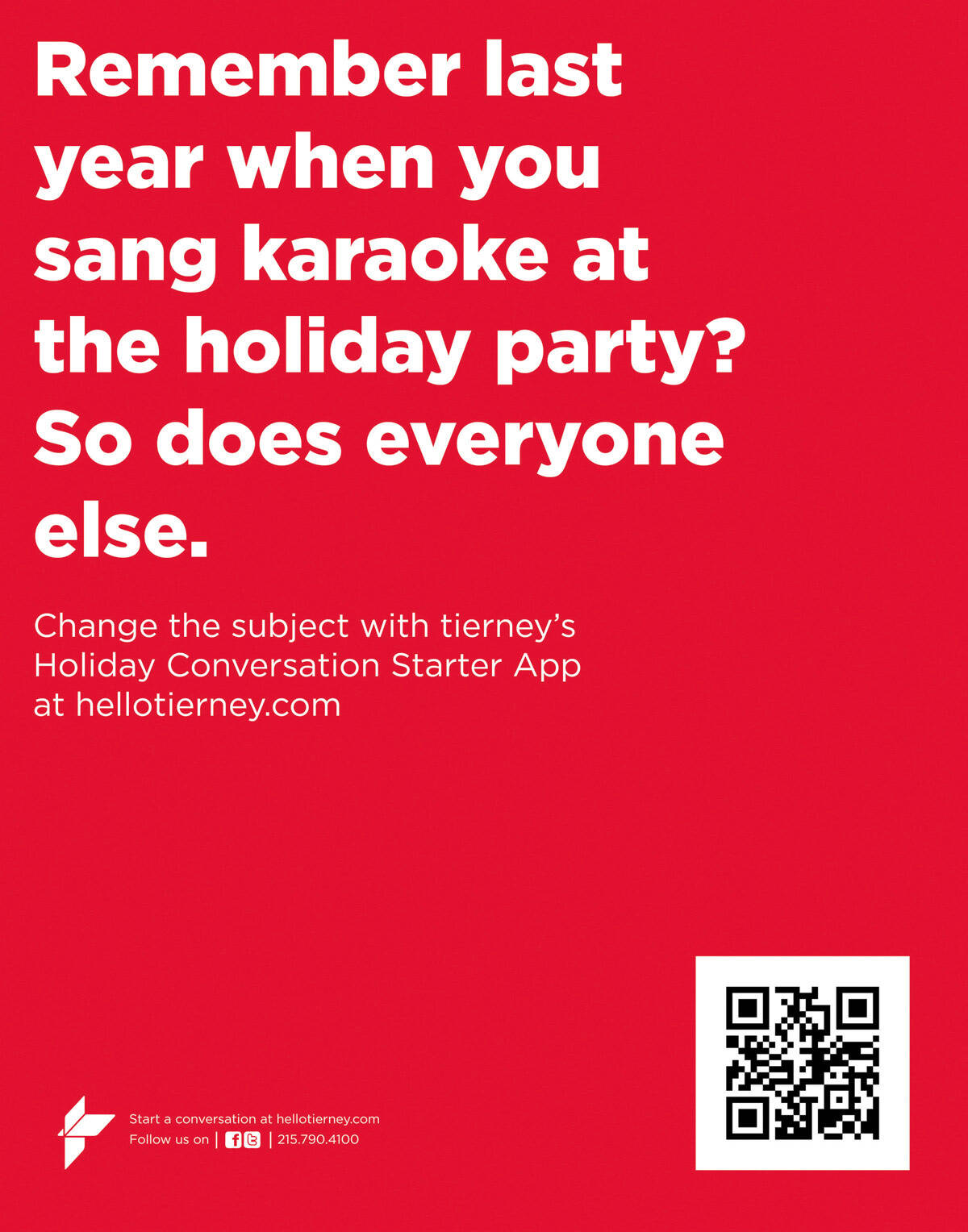 This professional campaign titled 'Sweater, Karaoke' was published in United States in December, 2010. It was created for the brand: Holiday Conversation Starter, by ad agency: Tierney. This Print medium campaign is related to the Electronics, Technology industry and contains 2 media assets. It was submitted almost 15 years ago.