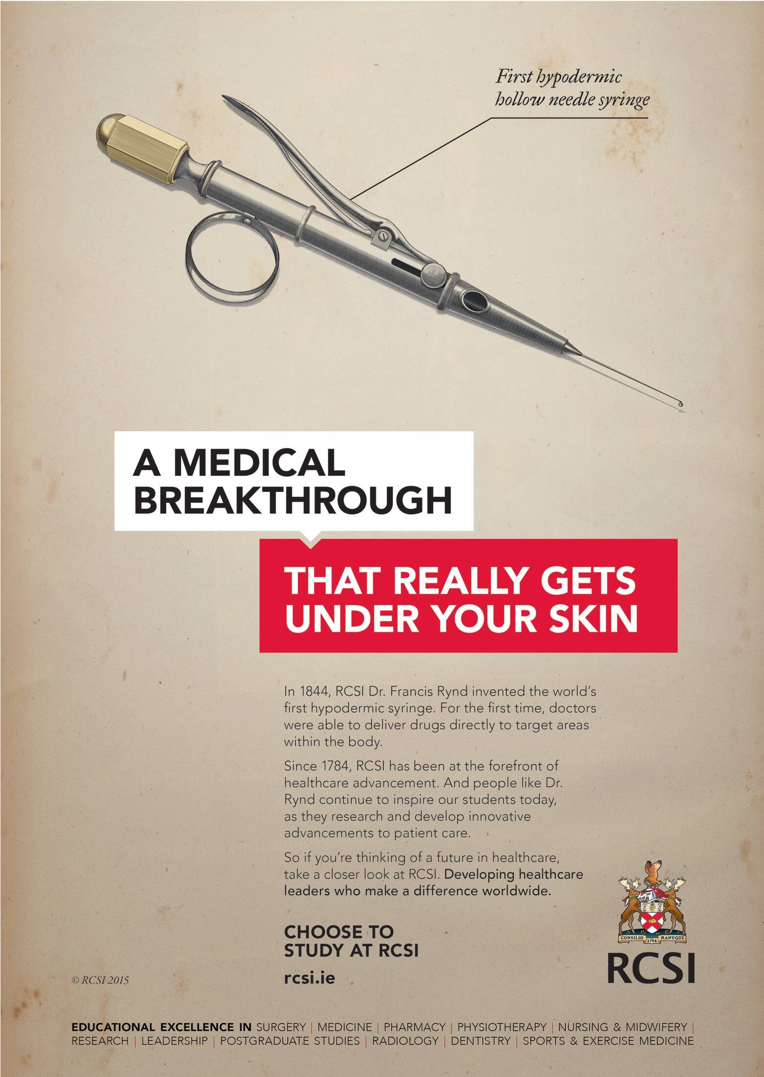 This professional campaign titled 'Syringe, Colles'' was published in Ireland in October, 2015. It was created for the brand: Royal College of Surgeons in Ireland, by ad agency: Publicis. This Print medium campaign is related to the Education industry and contains 2 media assets. It was submitted about 10 years ago.